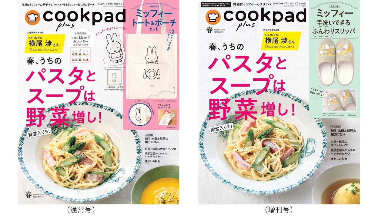 『cookpad plus(クックパッド プラス)2022年春号』は通常号に加え、セブン-イレブン・セブンネットで同時発売される増刊号が登場!それぞれ魅力的なミッフィーのグッズ付録付き
