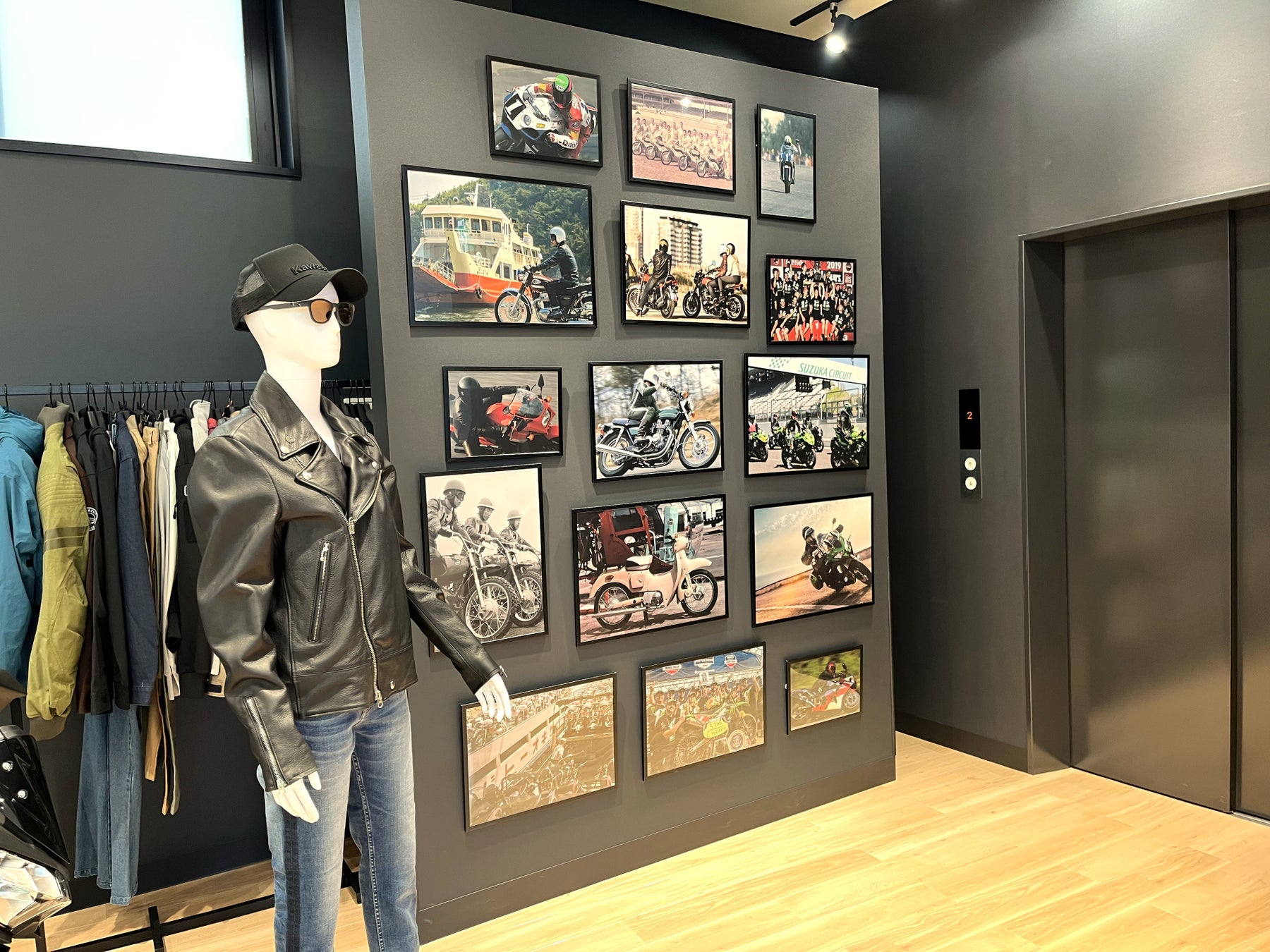 木目調のフロアと白い天井が織りなす明るい店内。モーターサイクルとプラザアパレルがゆったりと展示され、どなたでも楽しめる空間となっています。