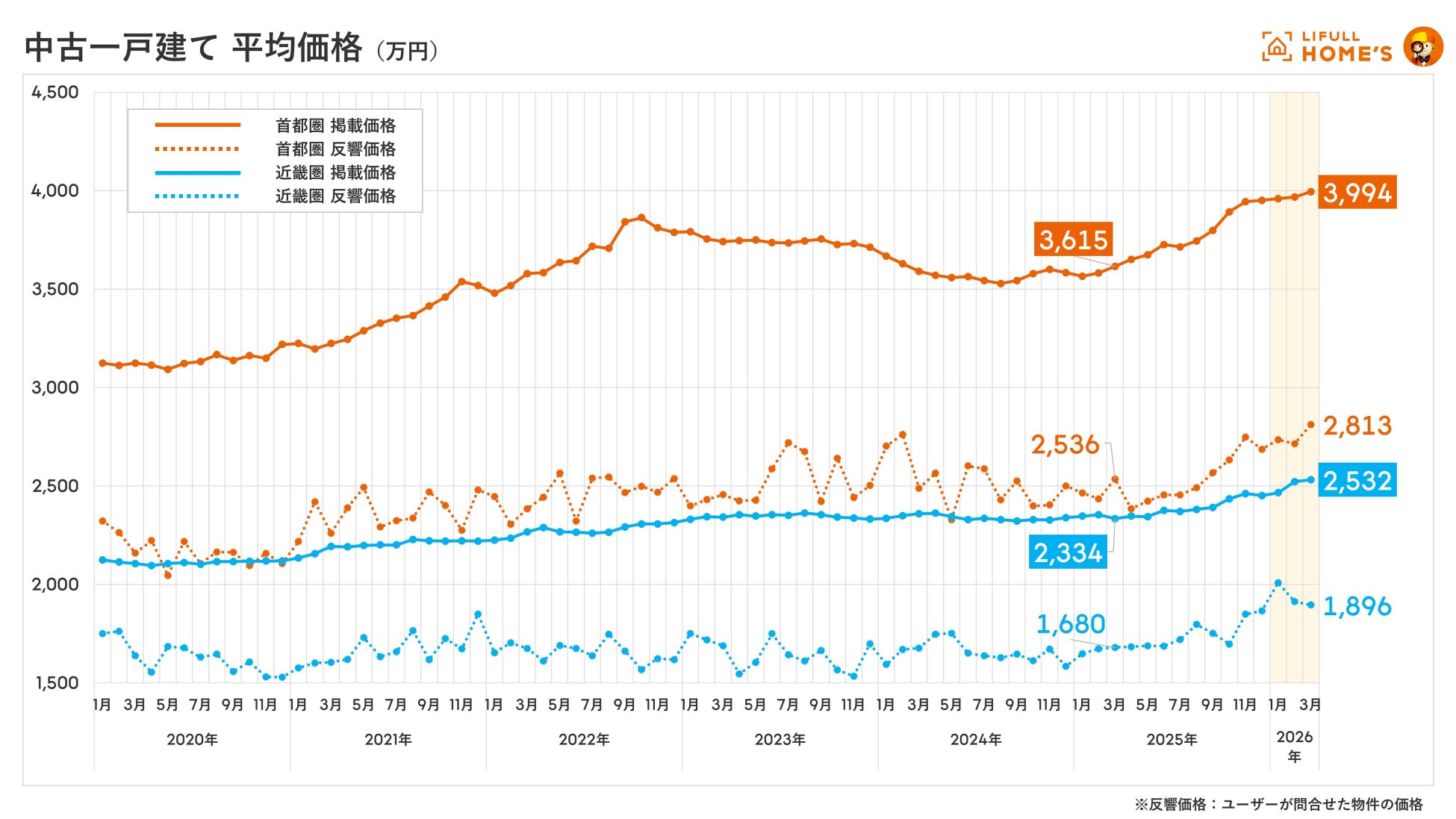 2026年3月の中古一戸建ての掲載価格は、首都圏3,994万円(前年同月比+10.5%)、近畿圏2,532万円(同+8.4%)となり、いずれも2020年の集計開始以降の最高値を更新しましたが、中古マンション価格と比べるとその上昇は限定的です。