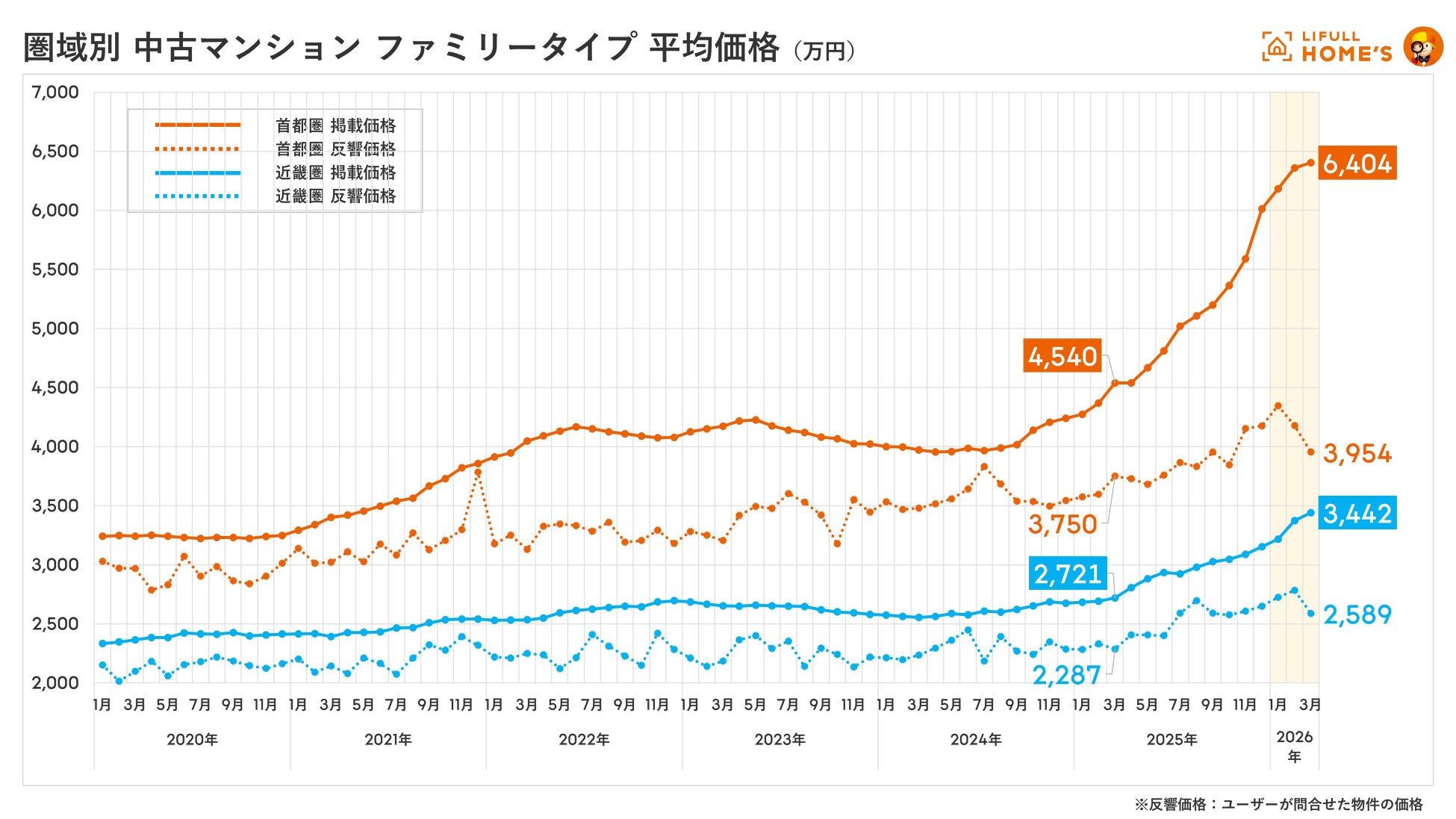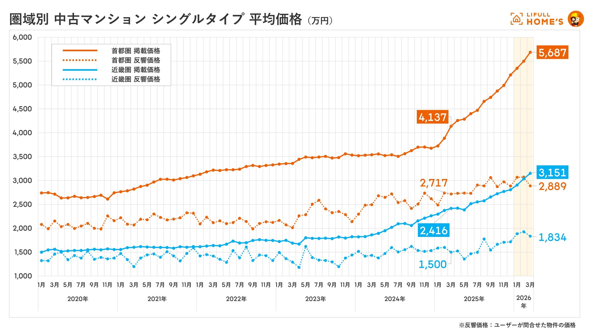2026年3月の中古マンション掲載価格は、首都圏シングルタイプ5,687万円(前年同月比+37.5%)、ファミリータイプ6,404万円(同+41.1%)となり、近畿圏とともに2020年の集計開始以降の最高値を更新しました。