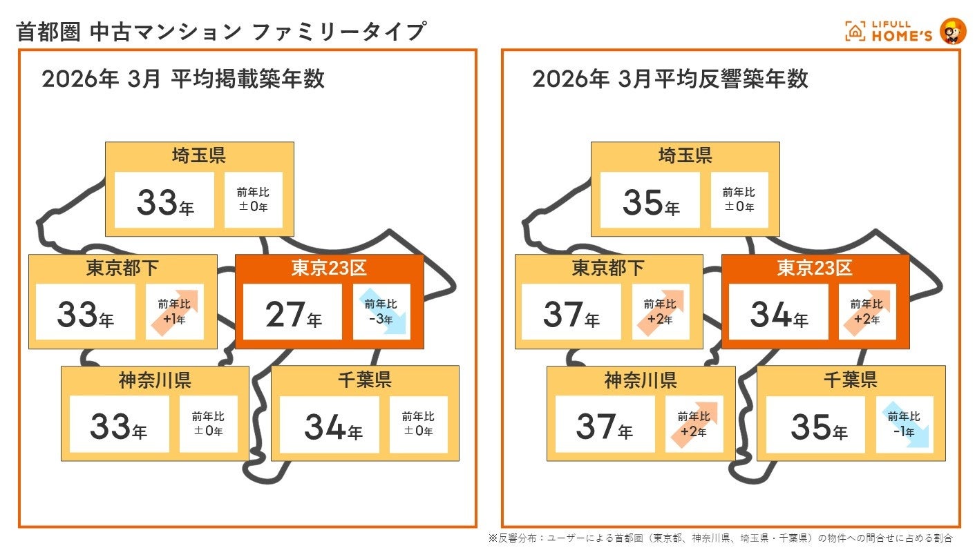 なお、価格が高騰する東京23区の反響シェアは拡大しており、資産性を重視する富裕層やパワーカップルによる高額物件への関心が高いことに加え、都心居住にこだわる層が築年数を妥協することで予算の帳尻を合わせている(2026年3月の東京23区の反響築年数は前年の約32年から34年へ上昇)傾向も見て取れます。