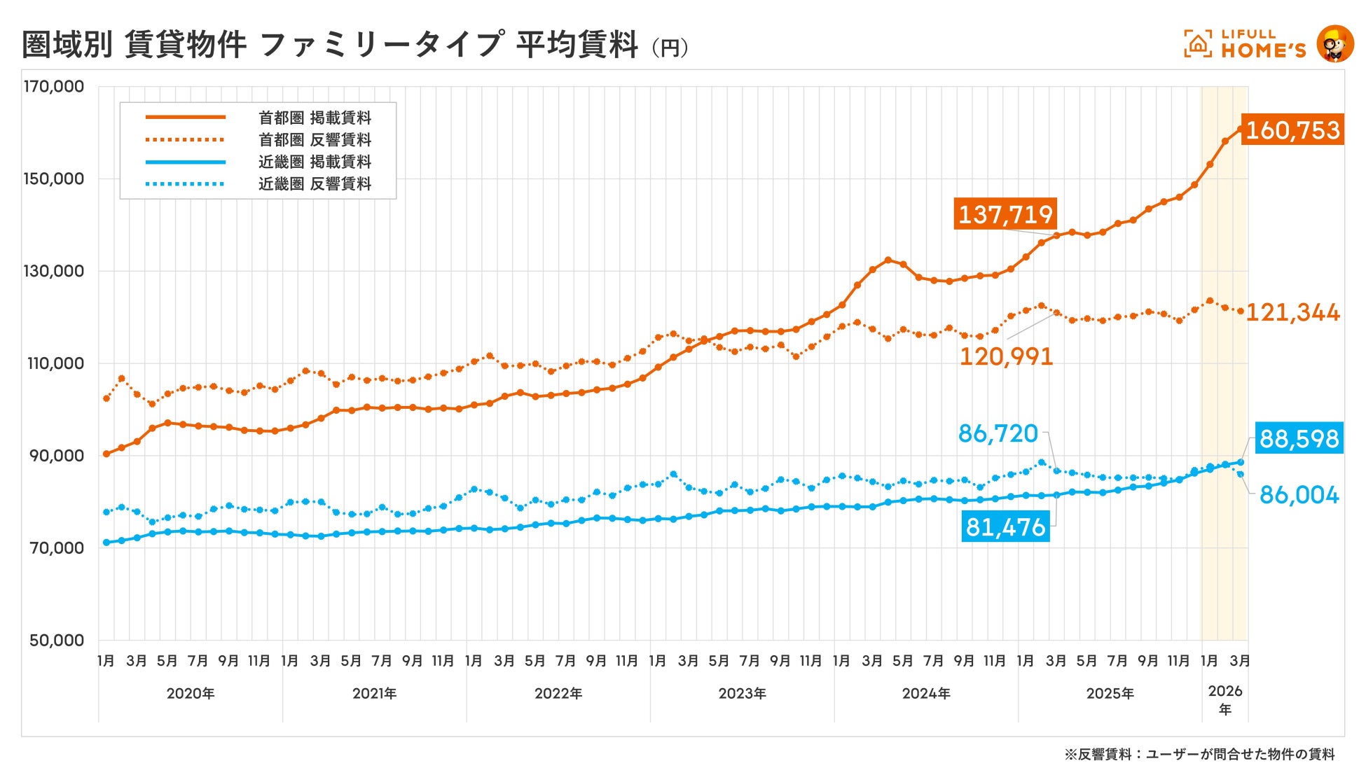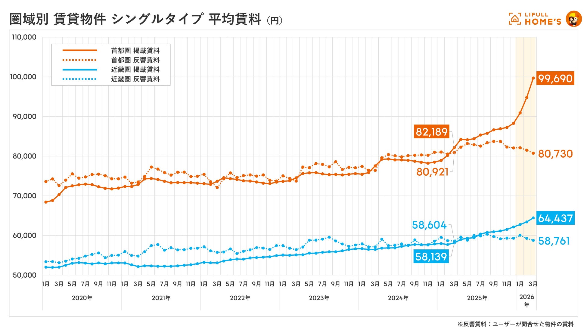 2026年3月の賃貸物件の掲載賃料は、首都圏(東京都、神奈川県、埼玉県、千葉県)シングルタイプで99,690円(前年同月比+21.3%)、ファミリータイプで160,753円(同+16.7%)となり、近畿圏(大阪府、兵庫県、京都府)とともに2020年の集計開始以降の最高値を更新しました。