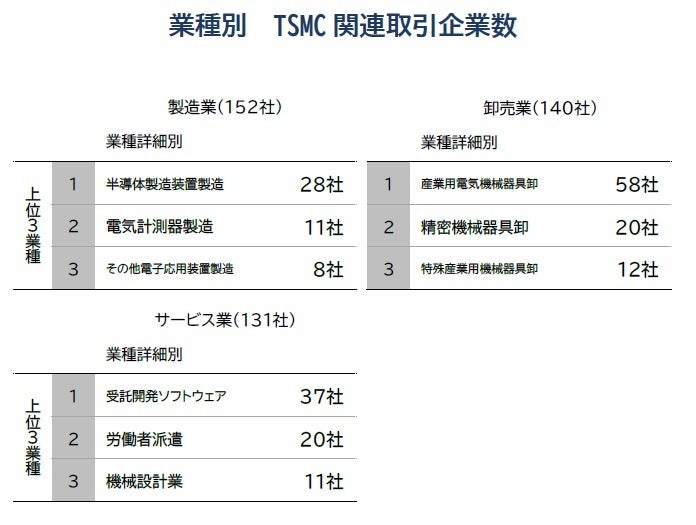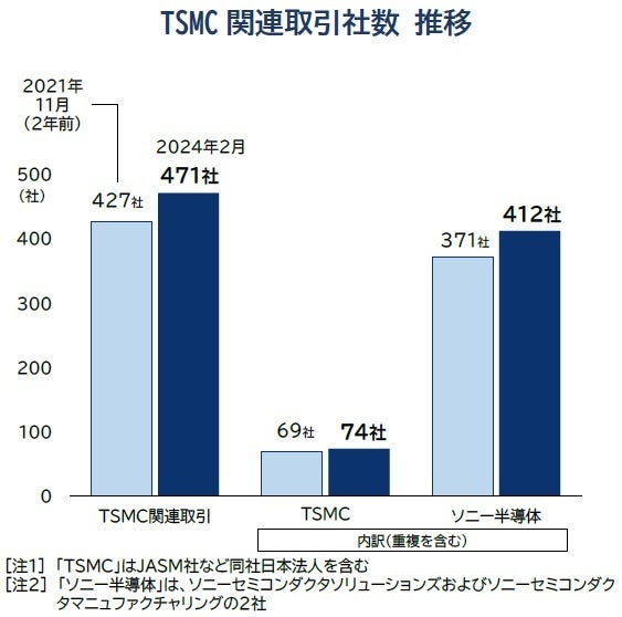 このうち、取引先別ではTSMCグループを取引先とする企業が74社、ソニー半導体と取引を行う企業が412社だった。TSMC、ソニー半導体企業ともに取引する企業も15社判明した。TSMC向けの取引社数は伸び悩んだものの、同社熊本工場に隣接し、スマートフォンなどに使われる画像センサーを生産するソニー半導体向け取引が大幅に伸長した。