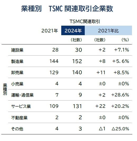 取引企業を地域別にみると、最も多いのは「関東」(229社)で、「九州」は全国で2番目に多い153社となった。「東北」など他地域ではいずれも50社未満にとどまり、関東と九州の2地域における企業が取引に参画していた。ただ、2年前と比較した社数の増加率は、「九州」が6社・4.1%の増加にとどまり、東京を中心とした「関東」(194社→229社)の35社・18.0%増に比べると低水準にとどまった。関東地方の企業では、シリコンウェハーなど半導体素材の提供や電子部品、半導体部材の生産装置製造といった企業が中心で、九州ではプラント建設のほか、廃水処理、クリーンルーム用品など消耗品(サプライ品)の供給といった内容が目立った。九州では取引社数が増加したものの、TSMCグループを頂点とした半導体サプライチェーンの構築は道半ばといえそうだ。