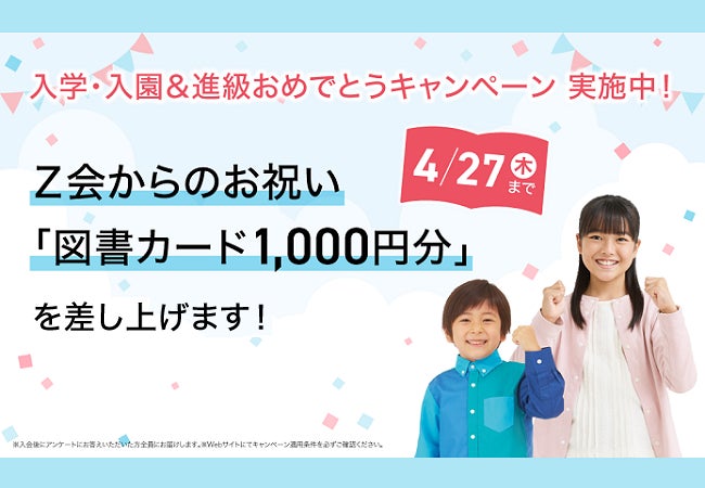 株式会社増進会ホールディングス(Z会グループ)のグループ会社である株式会社Z会は、「Z会の通信教育」幼児・小学生向けコースにおいて、「入学・入園&進級おめでとうキャンペーン」を実施中です。2023年4月27日(木)までのご入会で、お祝いに図書カード1,000円分を差し上げます。