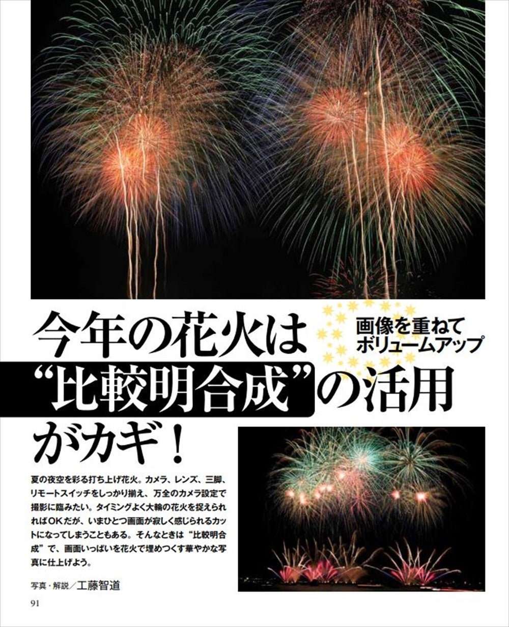 ただし、タイミングよく大輪の花火を捉えられればOKですが、いまひとつ画面が寂しく感じられるカットになってしまうことも。そんなときは”比較明合成”で、画面いっぱいを花火で埋めつくす華やかな写真に仕上げるのがコツです。カメラ設定から撮影方法、比較明合成の仕方など詳しく解説します。