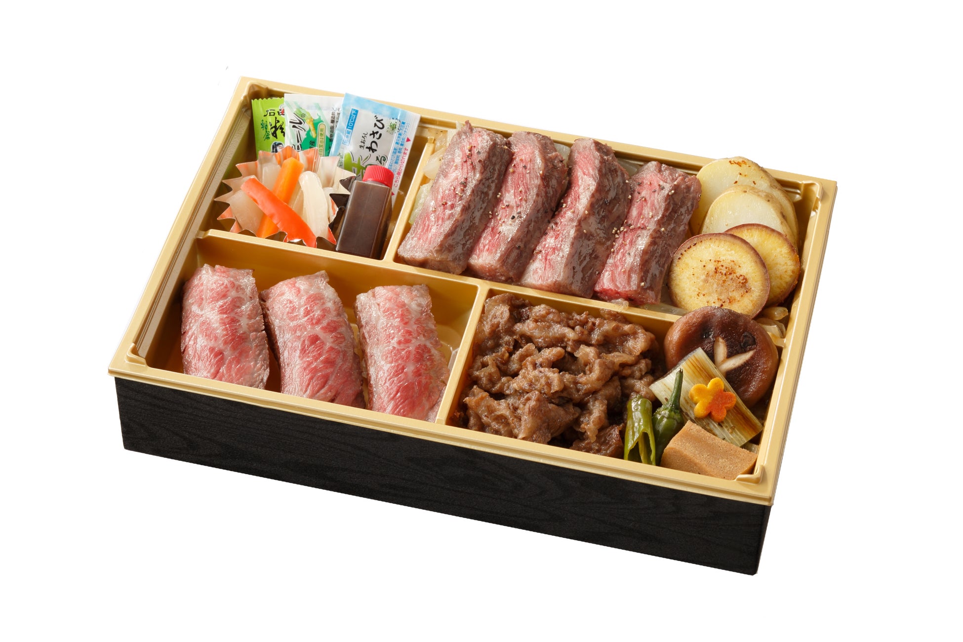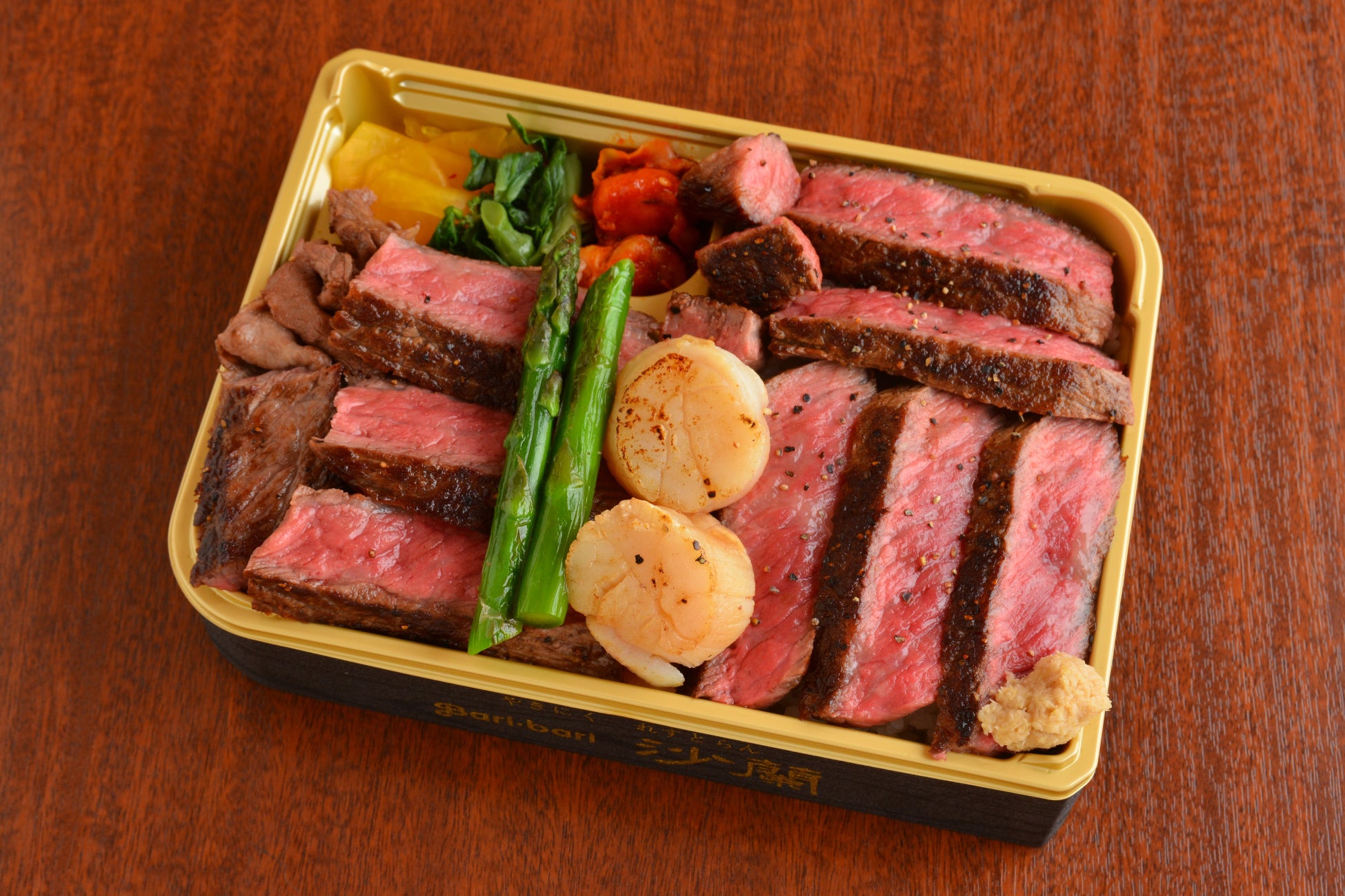 [和牛れすとらん沙蘭]はこだて大沼黒牛・道産牛・ふらの和牛の4種とホタテのステーキ盛合せ弁当(1折)2,916円<各日50折限り>