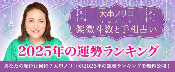人気占いバラエティ番組出演で今大注目の鑑定士・大串ノリコが監修する、紫微斗数(しびとすう)と手相占いに特化したスマホ専用月額占いサイト『大串ノリコ 紫微斗数と手相占い』。現在『2025年の運勢ランキング|あなたの順位は何位?大串ノリコの2025年の運勢ランキング』を無料で公開中です。この機会にぜひご利用ください。