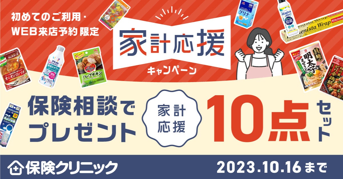 世界情勢や円安の影響により物価が上昇し、家計に大きな影響を与えています。家計の節約を考えるなら、保険の見直しがおすすめです。保障が重複することで必要以上に保険料を払っていたり、同じ保障でも保険会社を変えたりすると保険料が安くなる場合もあります。今回、皆さまの家計を応援したいという想いから、本キャンペーンの実施に至りました。保険クリニックは、今、そして将来においても皆さまが安心して暮らせるよう、保険を通してサポートいたします。
