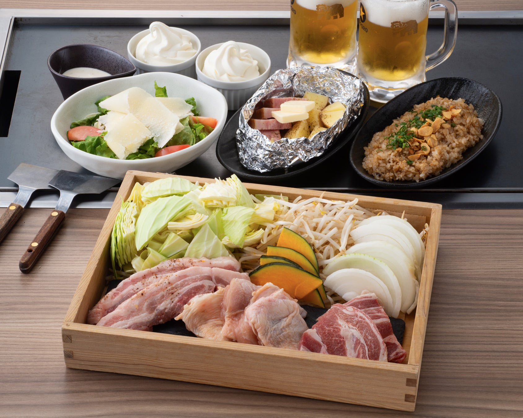 目の前の鉄板で海鮮・ジンギスカン・もんじゃを焼き上げる北海道BBQのライブ感と、キンキンに冷えた5種類のビール、種類豊富なビアカクテルなどをお楽しみいただける夏季限定の【北海道BBQプラン】、また BBQにもんじゃをプラスした【北海道BBQと選べるもんじゃプラン】をご用意しました。
