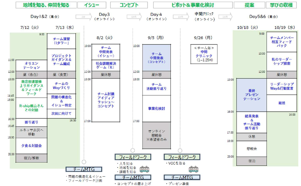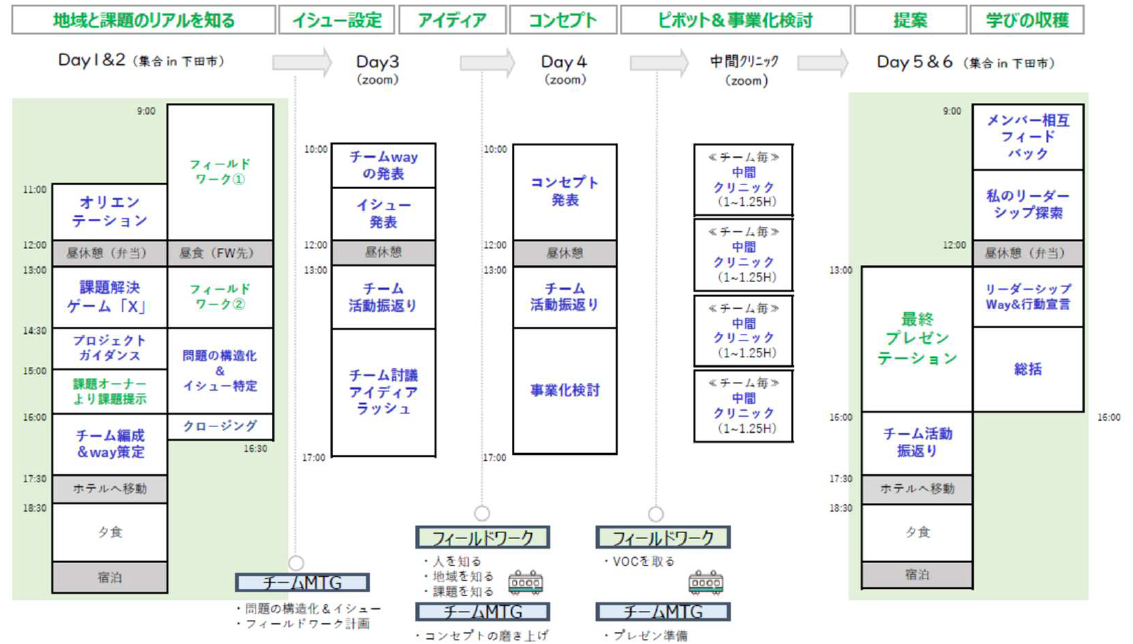 ・スケジュール:ワークショップDay1&2、5&6およびPJT活動のフィールドワークは下田市内で実施
