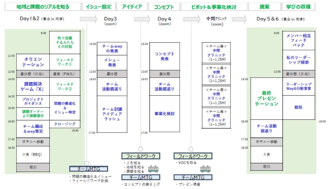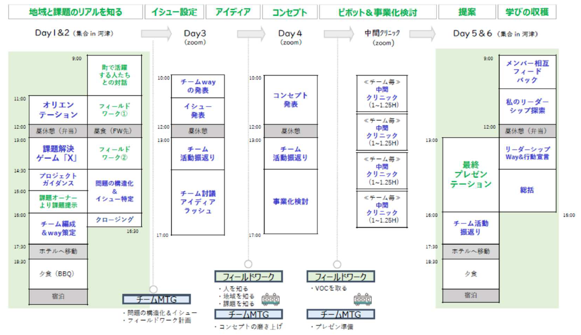 ・スケジュール:ワークショップDay1&2、5&6およびPJT活動のフィールドワークは河津町内で実施