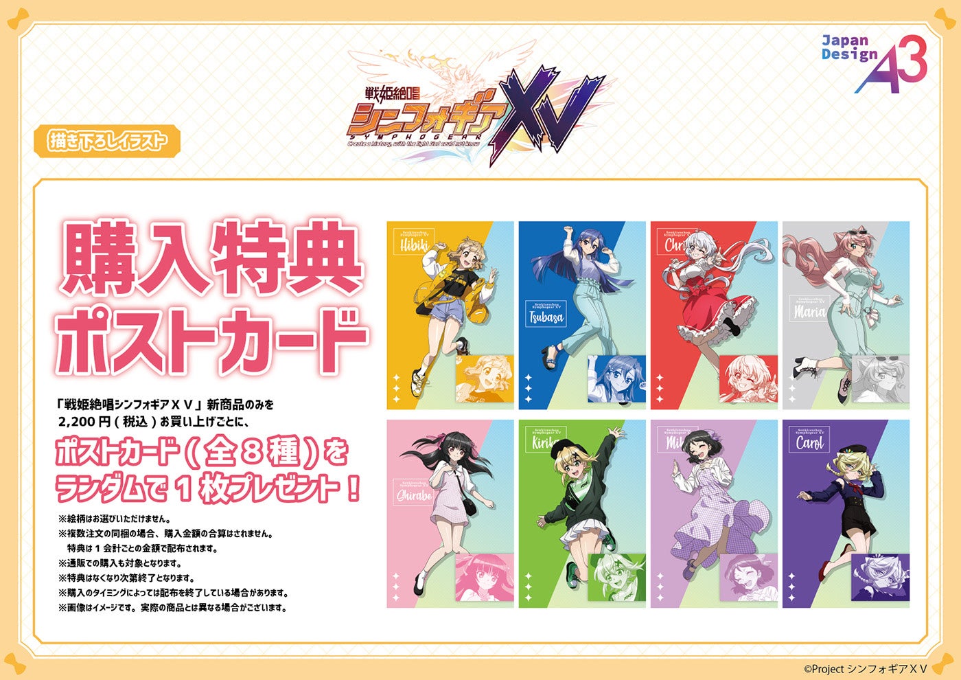 今回発売したTVアニメ『戦姫絶唱シンフォギアXV』の新作グッズのみを2,200円(税込)お買い上げごとに、ポストカード(全8種)をランダムで1枚プレゼントします。