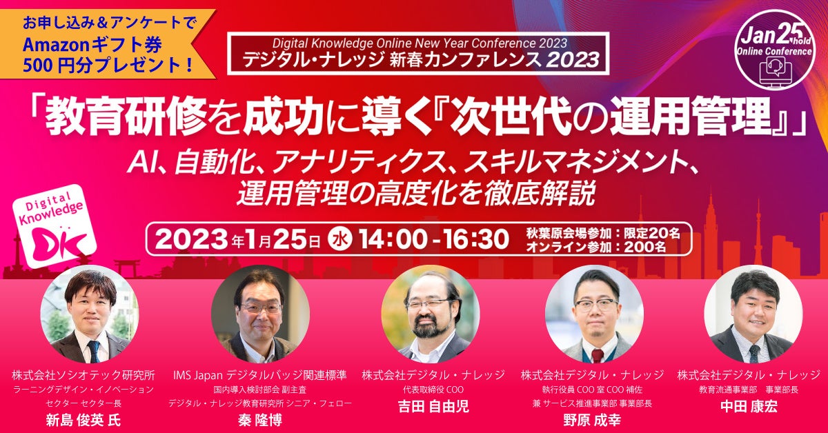 導入実績2000超を誇る 創業28年のeラーニング専門ソリューション企業、株式会社デジタル・ナレッジ(本社:東京都台東区、代表取締役社長:はが弘明)は、2023年1月25日(水)、デジタル・ナレッジ新春カンファレンス2023「教育研修を成功に導く『次世代の運用管理』」 (https://www.digital-knowledge.co.jp/online-conference/?prtimes)を開催致します。今回は、ソシオテック研究所さまをお招きした特別講演についてご案内します。