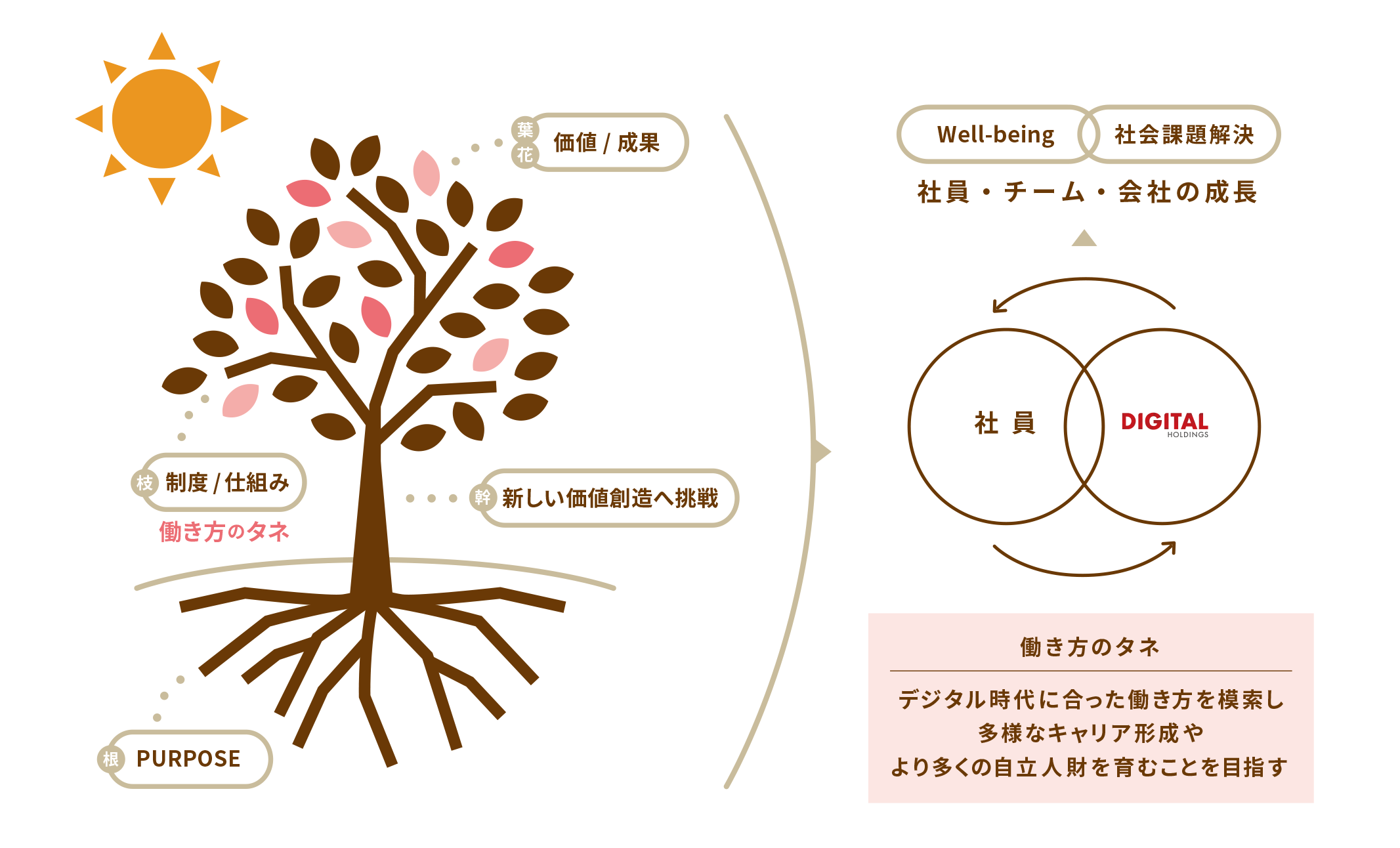 「働き方のタネ」は、デジタルホールディングスグループがこれまで行ってきた人事施策をもとに、デジタル時代に合った働き方を模索し、多様なキャリア形成やより多くの自立人財を育むことを目指し、新たに取り組みを開始したプロジェクトの総称です。なお、「働き方のタネ」の名称には、社員自身が「各施策=タネ」を状況に合わせて活用し、自分(たち)にしか出せない「価値・成果=花」を咲かせて欲しいという想いを込めています。