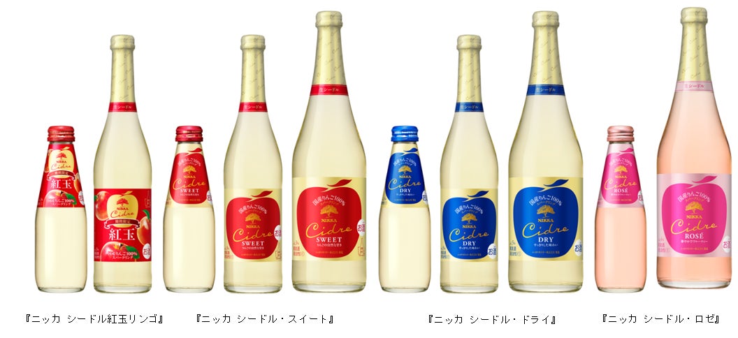 同日から通年商品『ニッカ シードル・スイート』『ニッカ シードル・ドライ』『ニッカ シードル・ロゼ』のパッケージをリニューアルするとともに、『ニッカ シードル・スイート』『ニッカ シードル・ドライ』ではこれまでのびん200ml・720mlサイズに加え、新たにびん500mlサイズを発売します。お客さまからの“200mlサイズでは物足りなく、もう少し容量が欲しい”“720mlでは飲み切れない”といったご要望にお応えするために、新たにびん500mlサイズをラインアップに加え、200ml・500ml・720mlの3種類でシードルの飲用喚起を図ります。
