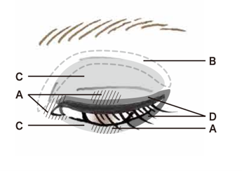 2.Dを目のキワに細チップで入れ、下まぶたの目尻から3分の2にも軽く入れます。