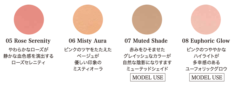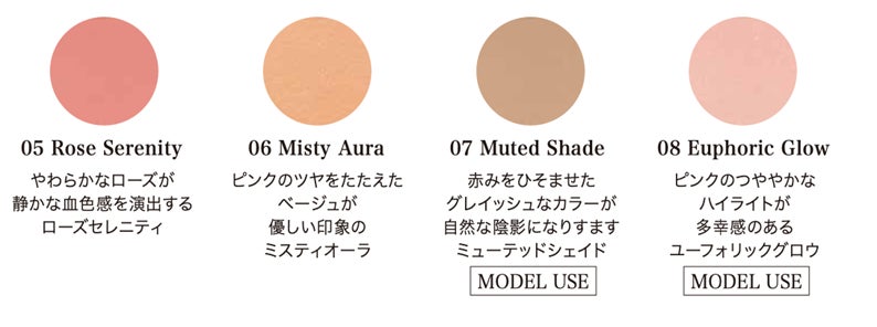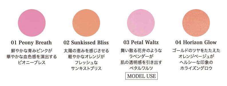 鮮やかさがふわりとのり、肌そのものが染まるようなクリアな発色。鮮やかな色も、テクニックレスに肌へ溶け込むようになじみます。