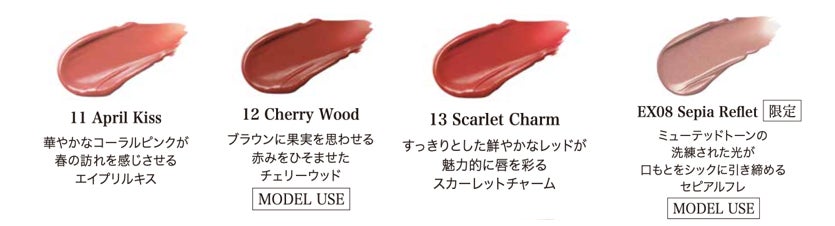うるおいを秘めた湿度感のある自然なツヤと、グレイッシュな要素をひそませたカラーが、色の個性を主張しながらも肌に溶け込むようになじむ設計。唇だけが浮くことなくシームレスな仕上がりに。