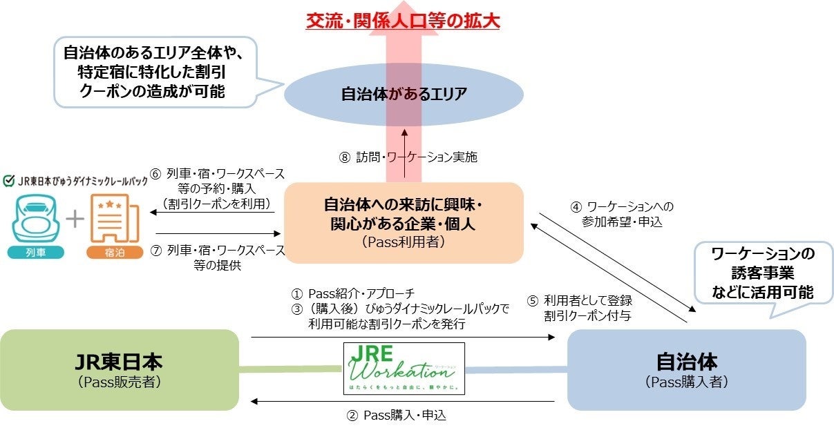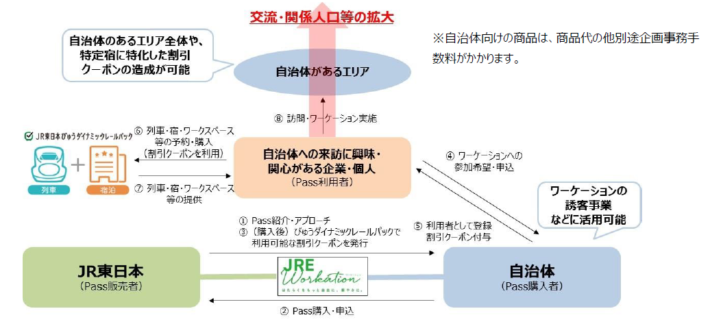 「JRE Workation Pass」は、誘客を希望する自治体が、そのエリアへの訪問に興味・関心がある企業・個人とのつながりを作ることなどを目的としてご活用いただけます。クーポンは、特定のエリアや宿に限定した設定も可能です。人材や企業価値を高めたい企業ニーズと、関係人口の創出、事業の活性化および企業との関係性の構築などを図りたい自治体ニーズを結びつけることで、企業・人・地域社会の「Well-being」の向上に取り組みます。