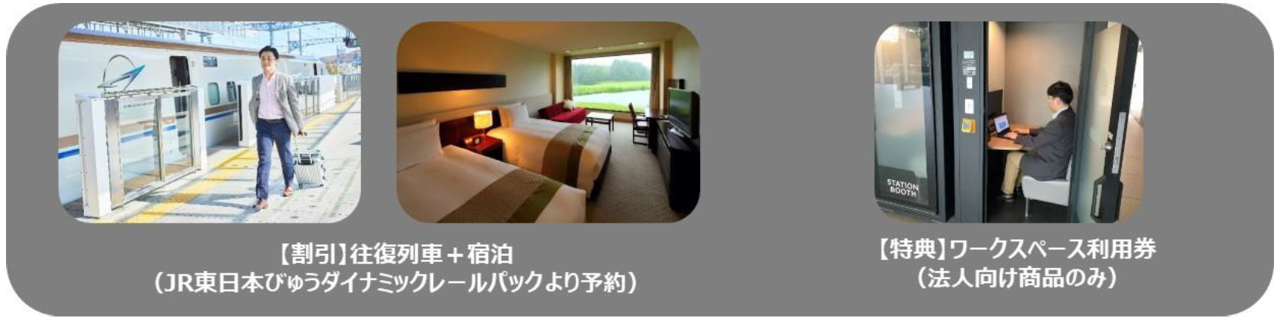 列車・宿泊・ワークスペースなどがセットでお得に繰り返し利用でき、ニーズに応じてご利用いただけるワーケーション商品を企業・自治体向けに加え、個人向けにも販売します。