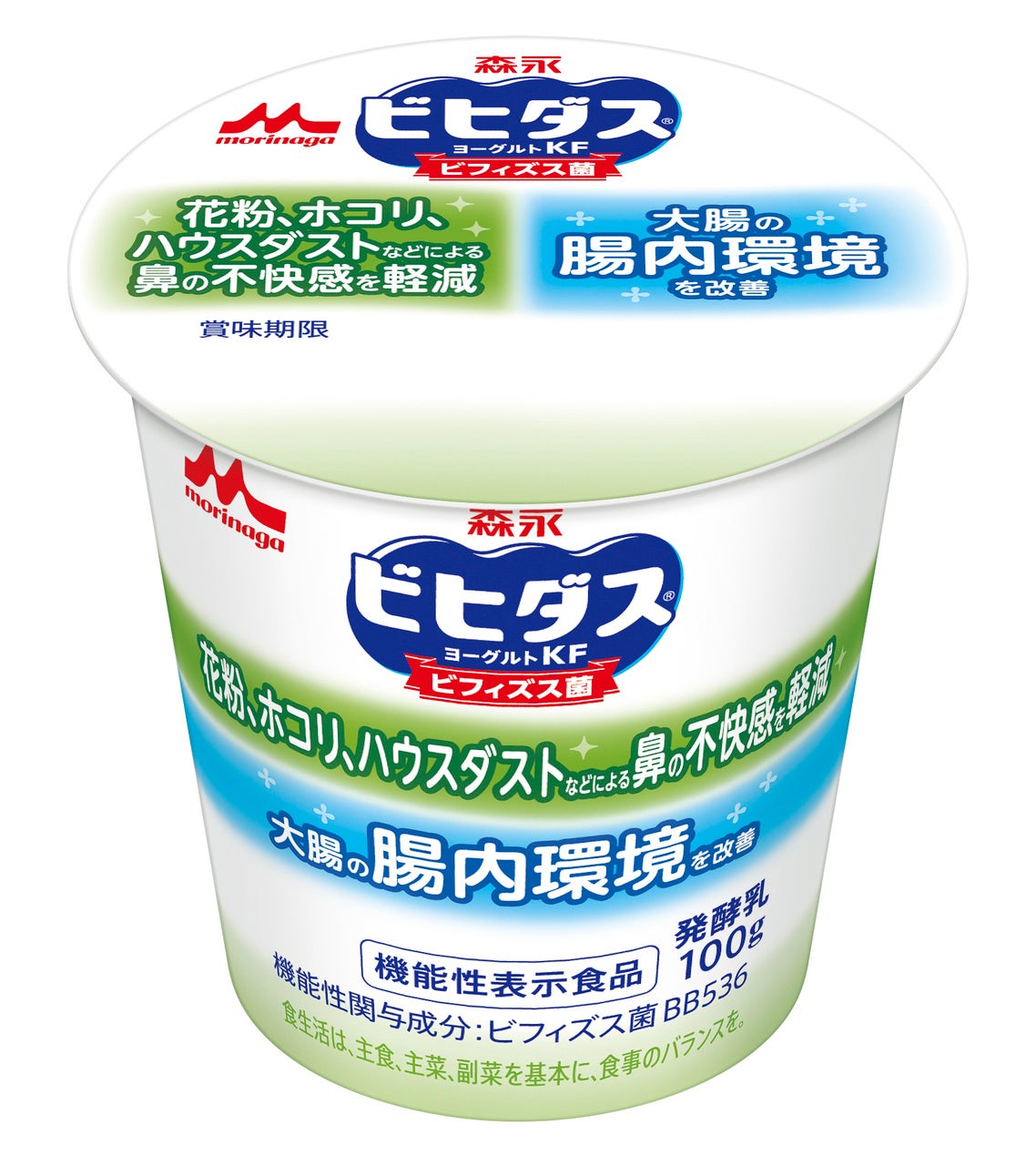 森永乳業は50年以上にわたって取り組んできた腸内細菌(腸内フローラ)やビフィズス菌研究を通じて、森永乳業独自のビフィズス菌である『ビフィズス菌BB536』が、花粉、ホコリ、ハウスダストなどによる鼻の不快感を軽減する作用を発見しました。2022年1月には、年々増加傾向にある鼻の不快感でお困りの方々を身近な食でサポートしたいという想いから、“世界初”※1花粉、ホコリ、ハウスダストなどによる鼻の不快感を軽減するヨーグルト「ビヒダス ヨーグルトKF」を発売しました。発売以来、季節を問わず年間を通じて安定した売上で推移し、多くの方からご支持いただいています。