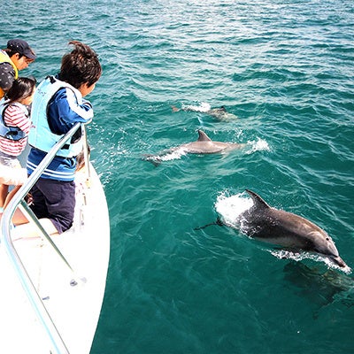上天草市松島から発着。季節に関係なく、1年中98%以上の確率で野生のイルカに遭遇できる世界屈指のスポットで、イルカが船に並走して泳いだり目の前でジャンプしたりと、野生動物の素晴らしさや力強さを体験することができます。