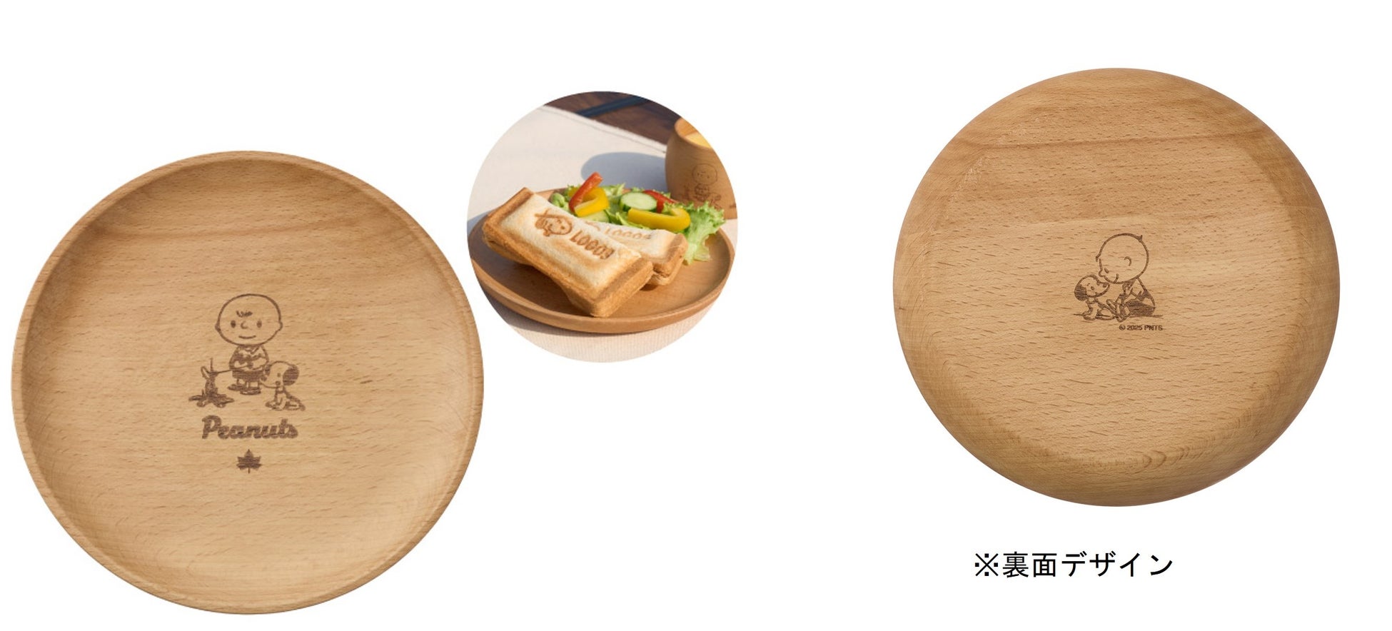 やさしい温もりで食卓を彩る木製のプレート。カトラリー同様、素材には天然のブナ材を使用しており、自然素材ならではの温かみと優しい丸みのあるフォルムが魅力。プレートの表面と底面にコミック「PEANUTS」誕生75周年を記念したデザインロゴが施されている。