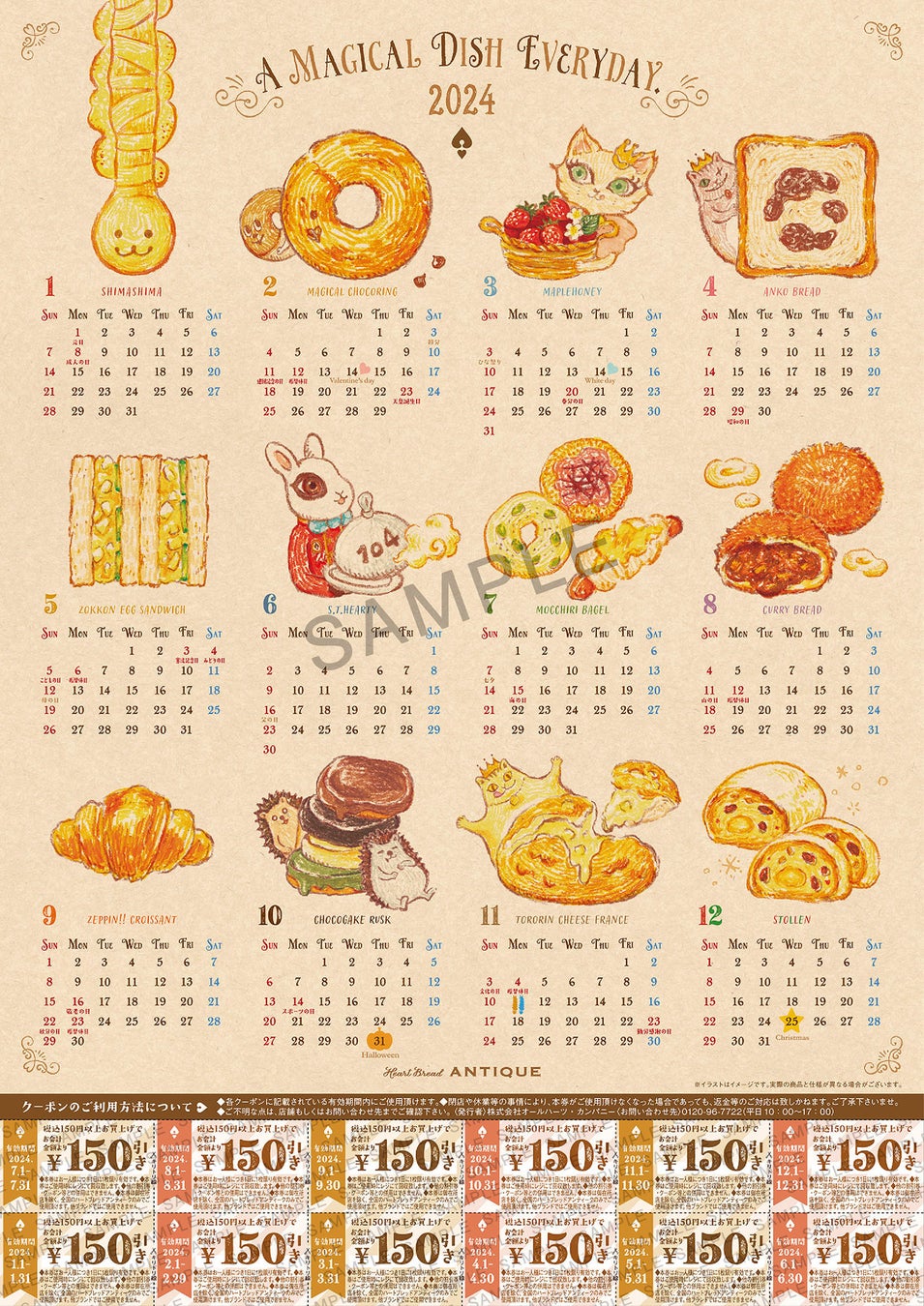 『クーポン付きカレンダー』は、マジカルアンティークワールドのキャラクターと『あん食パン』、『しましま』などの人気商品のイラストが描かれた可愛らしいデザインで仕上げました。