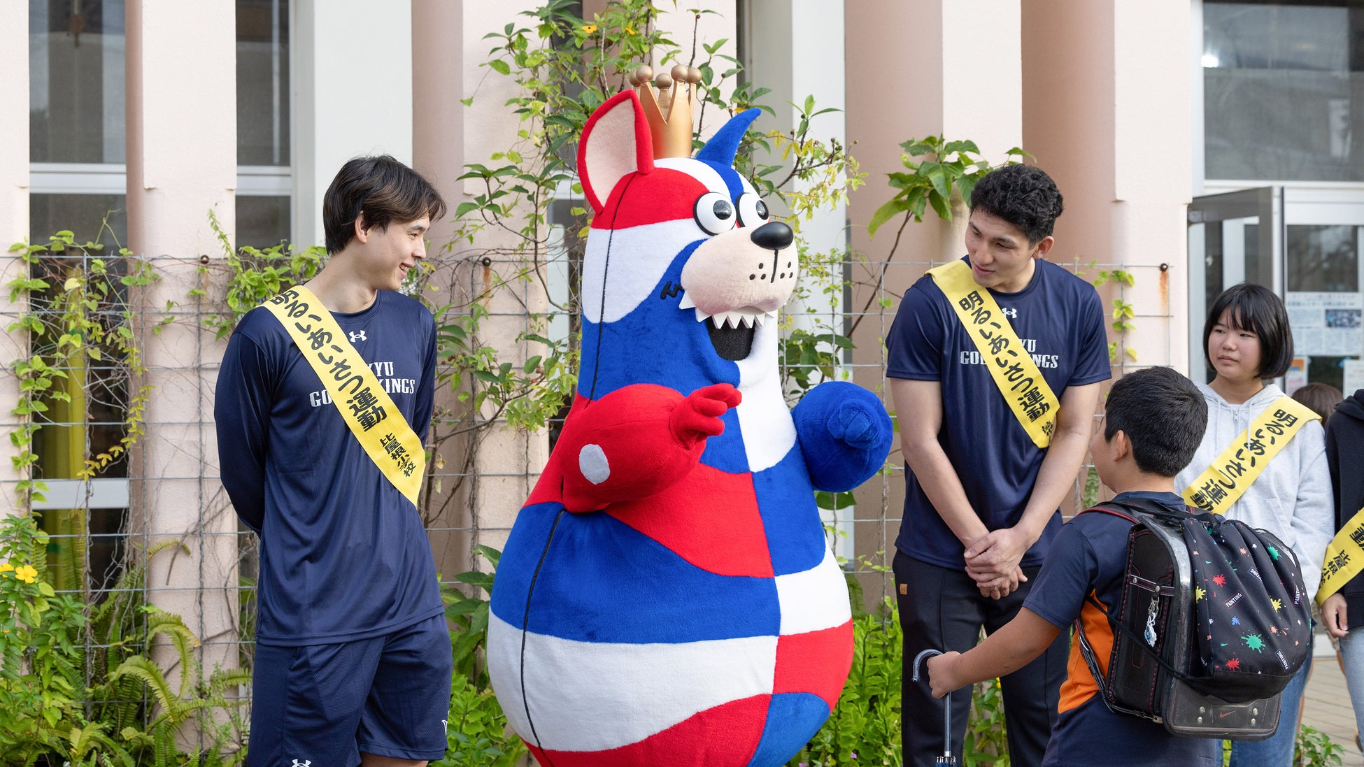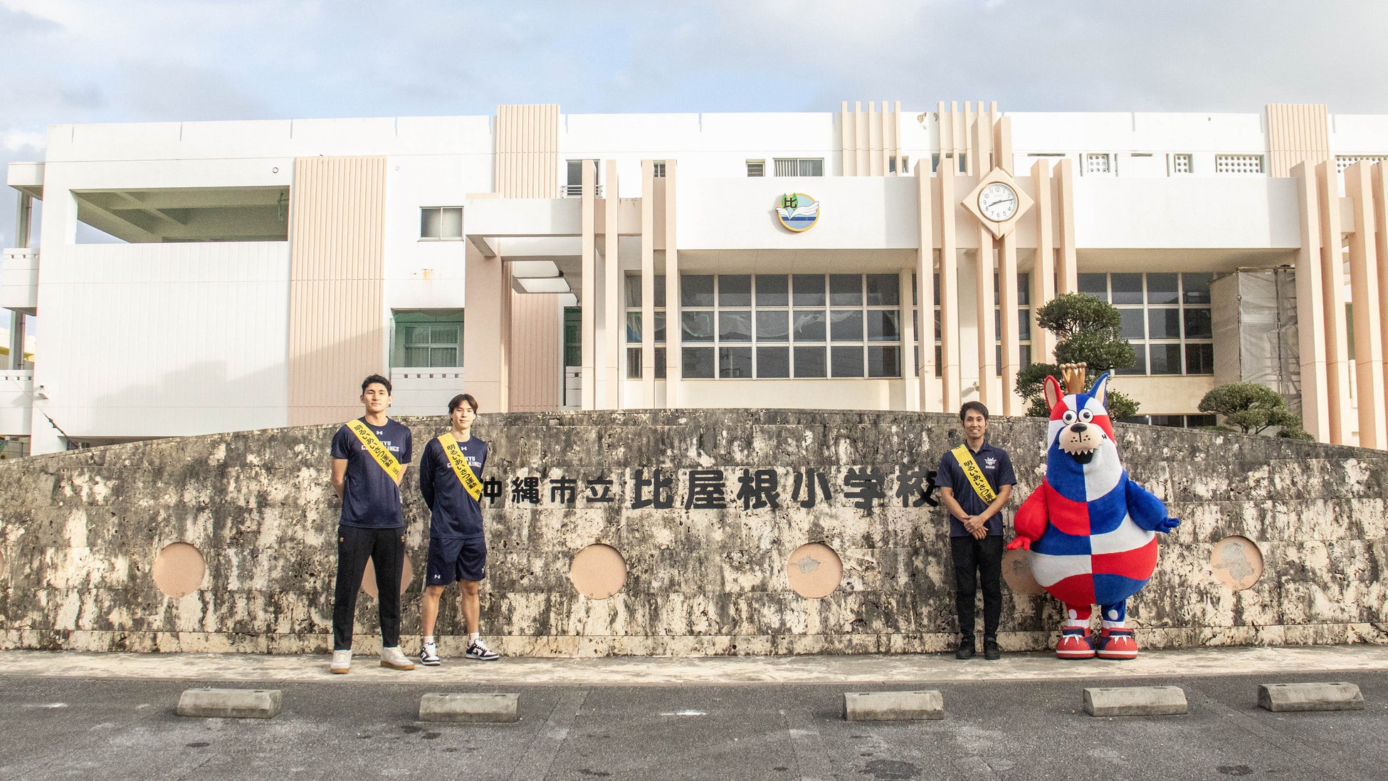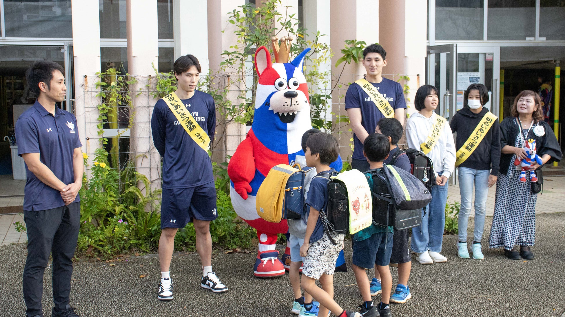 11月18日(月)にホームタウン沖縄市の比屋根小学校にて、「おおきなわ」の活動の一環として行なっている「朝のあいさつ運動」を実施し、#8 植松義也選手、#10 荒川颯選手がゴーディーと一緒に参加しました。ご協力いただいた比屋根小学校の皆さま、ありがとうございました。