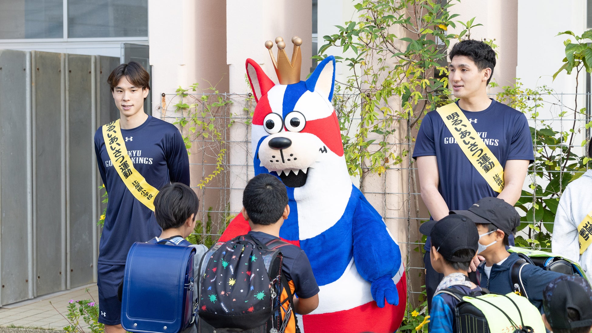 朝のあいさつを行いながら、選手たちに身長や出身地などを質問する子どもたちも多く、普段はなかなか接することができないキングスの選手たちの訪問を喜んでいる様子でした。ゴーディーも子どもたちから「ゴーディーまた来てくれたね!おかえり!」と声をかけてもらい、あいさつ運動を通して多くの子どもたちと交流することができました。