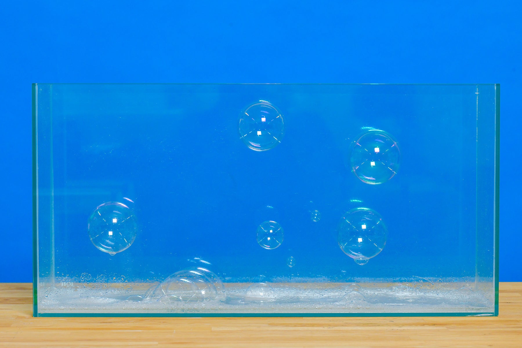 水そうの中にクエン酸と重ソウを入れて水をかけると、ある気体が発生する。その水そうの中にシャボン玉をふきいれると、シャボン玉は底に落ちずにうき続ける。