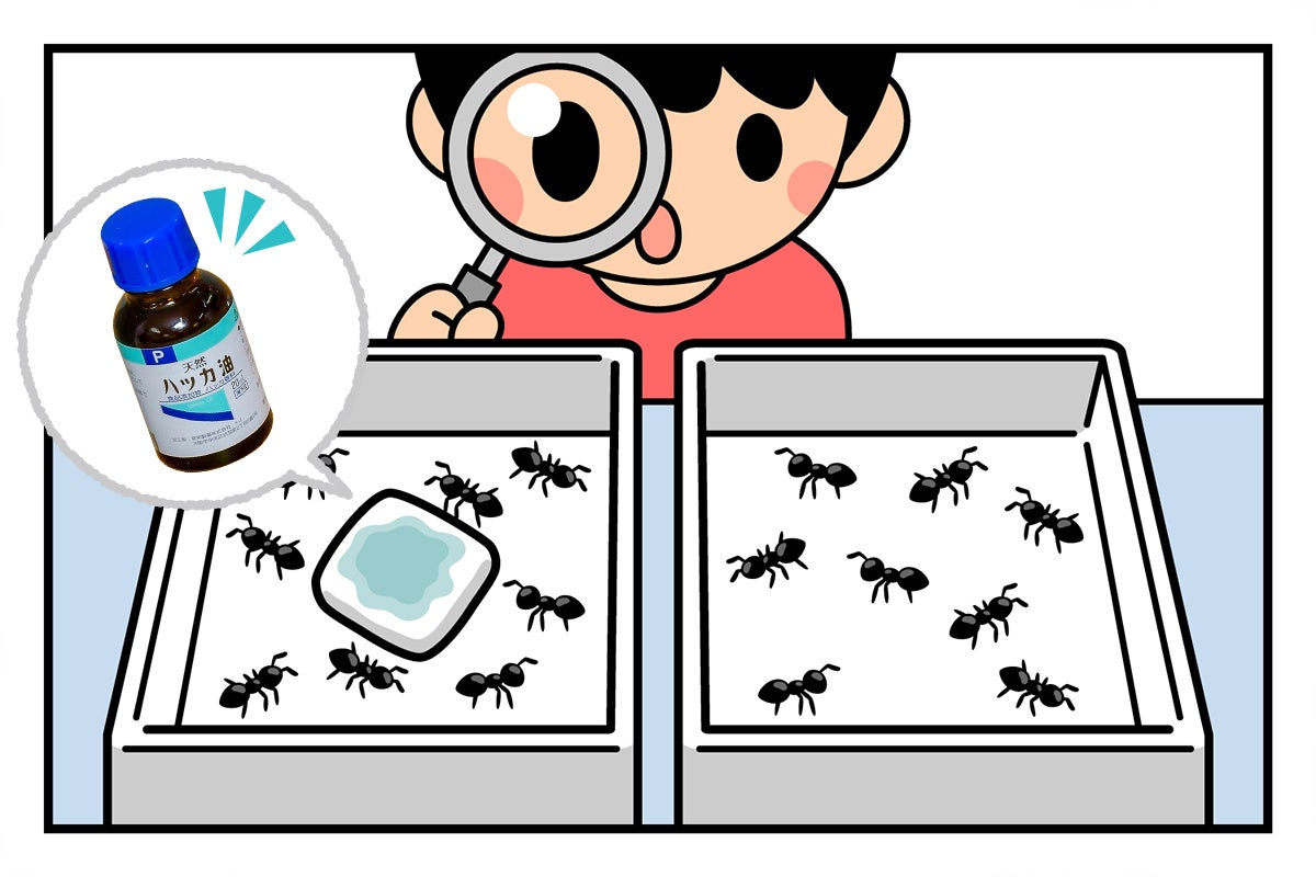ハッカ油と無水エタノールから虫よけスプレーをつくる。虫よけスプレーをかけた脱脂綿を置いてアリの行動の変化を観察するなどし、その効果を確認する。