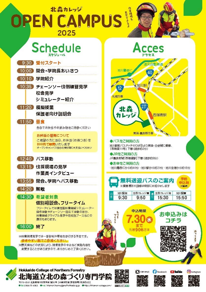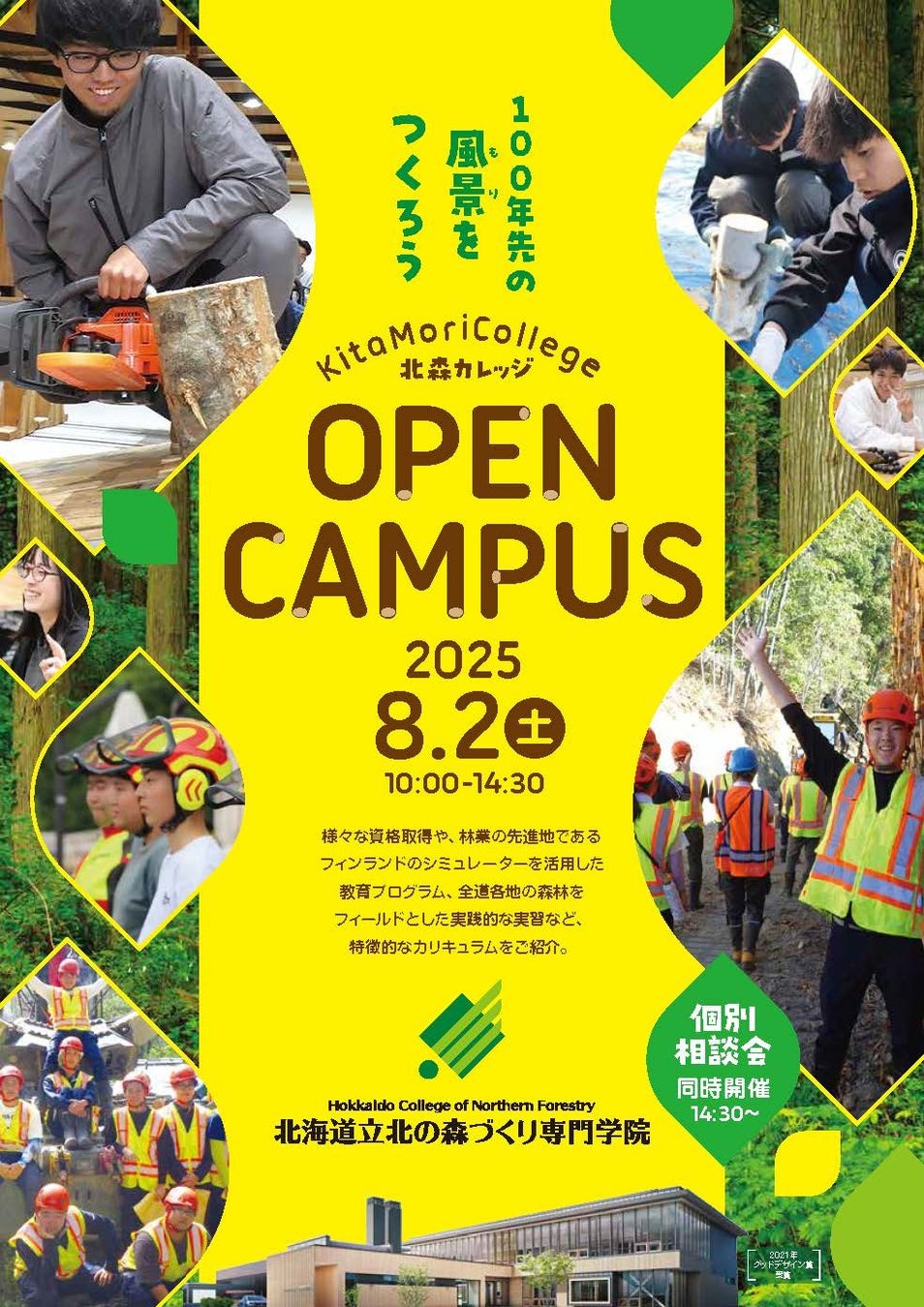 北海道立北の森づくり専門学院(略称:北森カレッジ)では、来年度以降の生徒募集に向けて、次のとおり「オープンキャンパス」を開催します。
