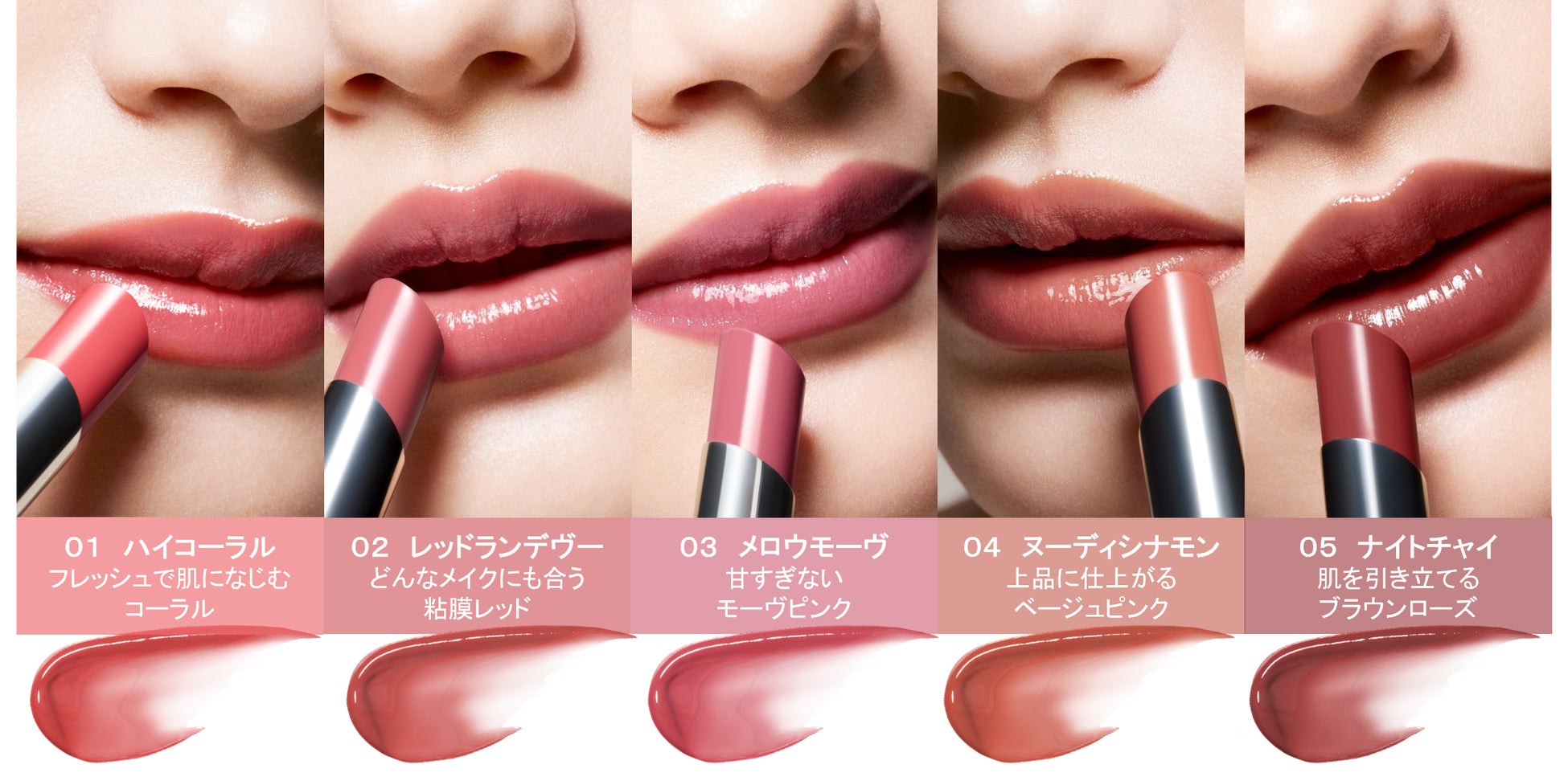 肌なじみのよい透け感のあるの5色展開で、一人ひとりに似合うリップメイクをかなえます。