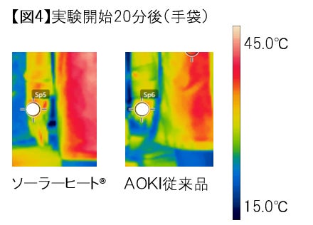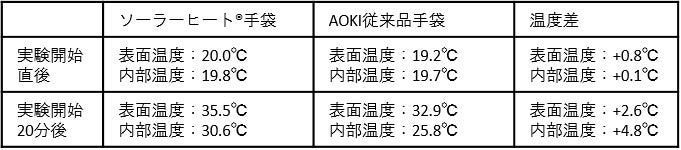 実験開始20分後のソーラーヒート®手袋とAOKI従来品手袋の表面温度差は2.6℃、内部温度差は4.8℃でした。
