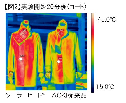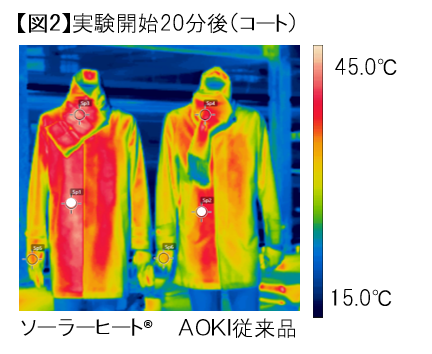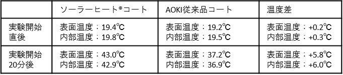 実験開始20分後のソーラーヒート®コートとAOKI従来品コートの表面温度差は5.8℃、内部温度差は6.0℃でした。