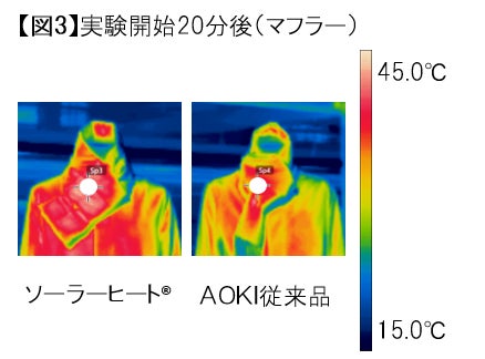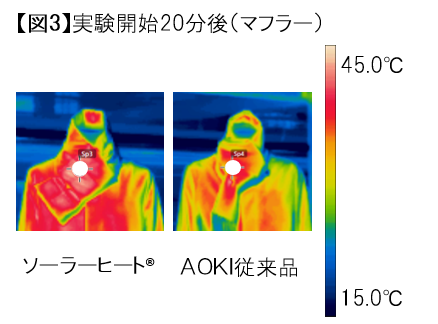 実験開始20分後のソーラーヒート®ダウンマフラーとAOKI従来品マフラーの表面温度差は4.9℃、内部温度差は6.9℃でした。