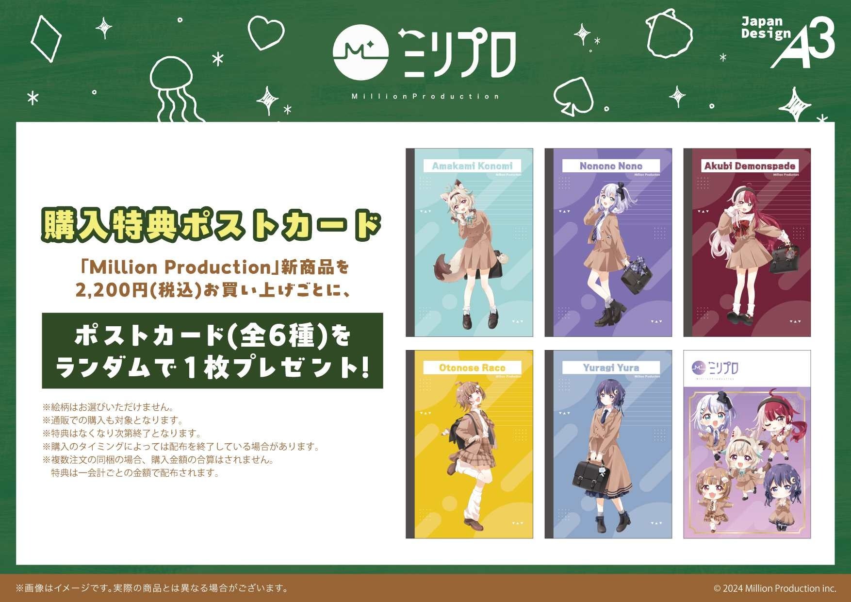 今回発売した『ミリプロ』の新作グッズを2,200円(税込)お買い上げごとに、ポストカード(全6種)をランダムで1枚プレゼントします。