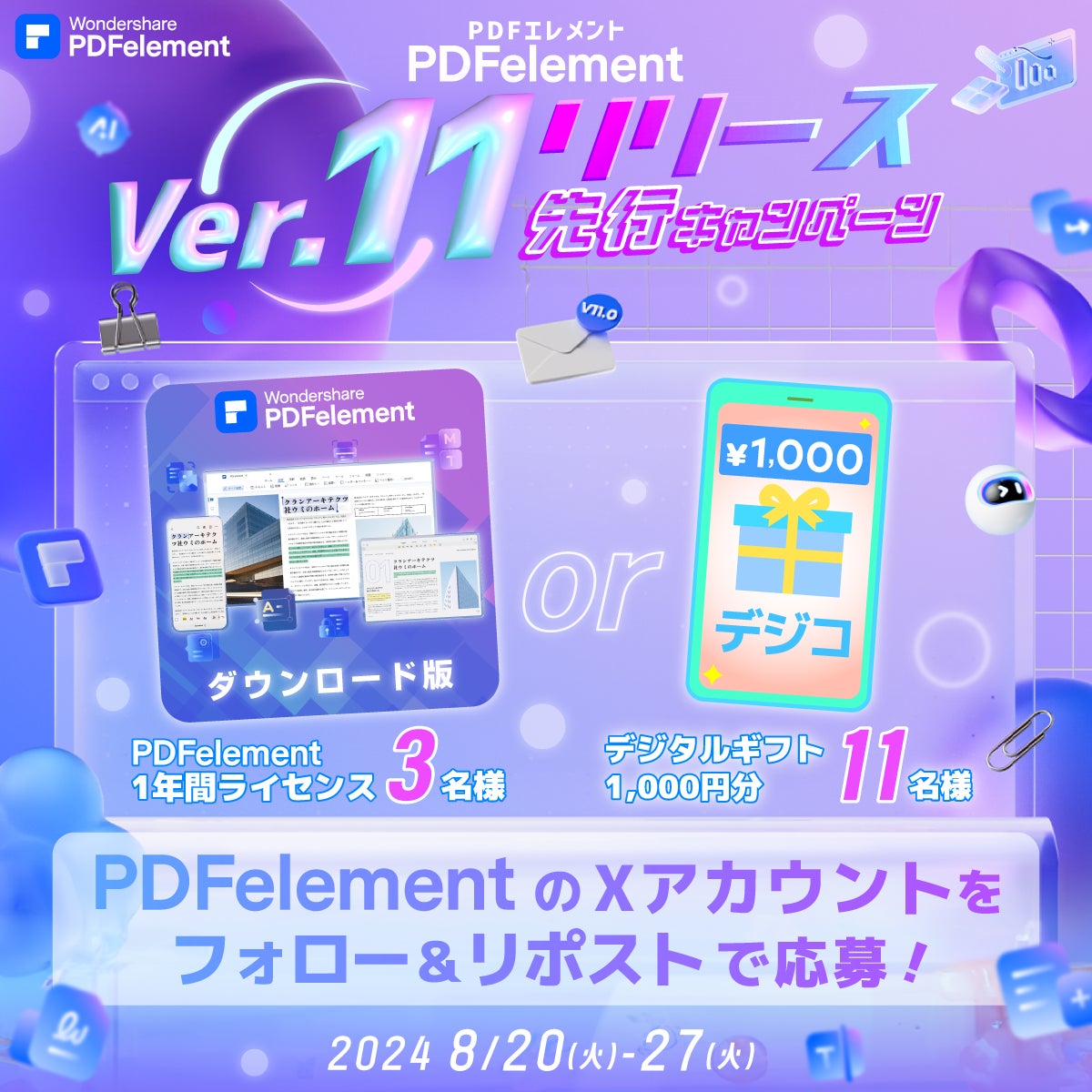 【デジタルギフトカードなど豪華商品が当たる!】PDF編集ソフト『PDFエレメント』バージョン11リリース!リリース記念キャンペーン第一弾開始!|Wondershare PDFelement
