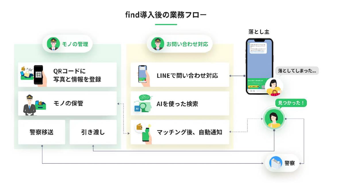 落とし主の「連絡するだけでも大変」「探したくても見つからない」という悩み・不安を、テクノロジーの力によって解決するサービスです。お忘れ物対応・管理を行う駅や商業施設等が導入することで、利用者の満足度向上並びに社内の業務効率化に貢献します。