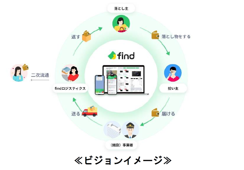 find社は「落とし物が必ず見つかる世界へ」というビジョンのもと、「新たな感謝を生み出す、世界的な落とし物プラットフォームを創る」をミッションに掲げています。将来的には、全世界の落とし物にまつわる課題を循環型のサービスによって解決していくことを構想しています(下記イメージ)。