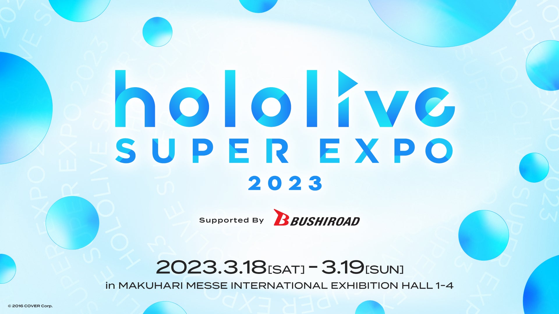 カバー株式会社(本社:東京都千代田区、代表取締役社長:谷郷元昭)は、当社が運営する「ホロライブプロダクション」において、2回目の事務所全体イベントとなる《hololive SUPER EXPO 2023 Supported By Bushiroad》および《hololive 4th fes. Our Bright Parade Supported By Bushiroad》を、2023年3月18日(土)、19日(日)に幕張メッセ「国際展示場1-4ホール」・「幕張イベントホール」にて開催する事をお知らせいたします。
