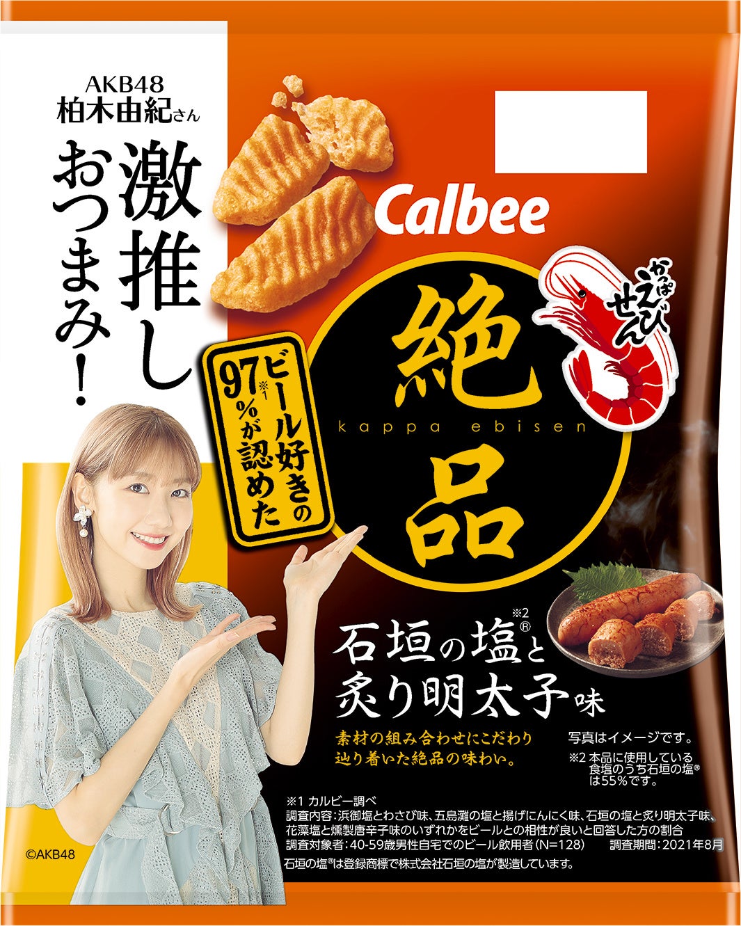 『絶品かっぱえびせん 石垣の塩®️と炙り明太子味』は、「こだわりの塩」として塩カドの無いまろやかな味わいで「かっぱえびせん」のエビの風味を引き立てる「石垣の塩®️」※3を選定。塩で引き立つ素材に、おつまみメニューとして人気が高い「炙り明太子」を組み合わせたお酒がすすむベストな設計を追求した商品です。2021年2月に期間限定で発売したところ、お客様から「エビの風味と炙り明太子が相性抜群」「塩加減が絶妙で、辛さだけでなく旨みも感じてビールにピッタリ」等の感想とともに、再販売を望むお声を多くいただいたため、このたびの再発売が決定しました。再発売にあたり、ターゲット層を中心に幅広い人気を誇るAKB48の柏木由紀さんを広告キャラクターに起用し、期間限定の特別パッケージやタイアップ動画を公開します。