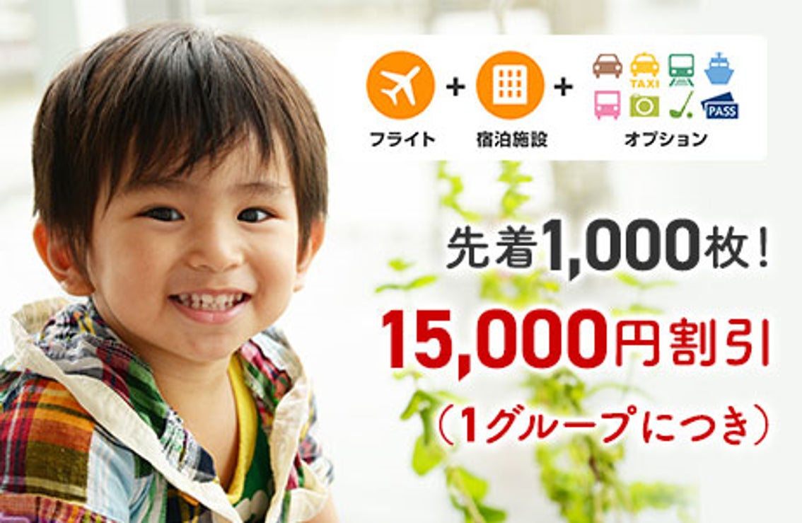 ◆JALダイナミックパッケージ(国内)では、「お子さまと行く旅クーポン(先着1,000枚)」のご利用で15,000円割引となります。
