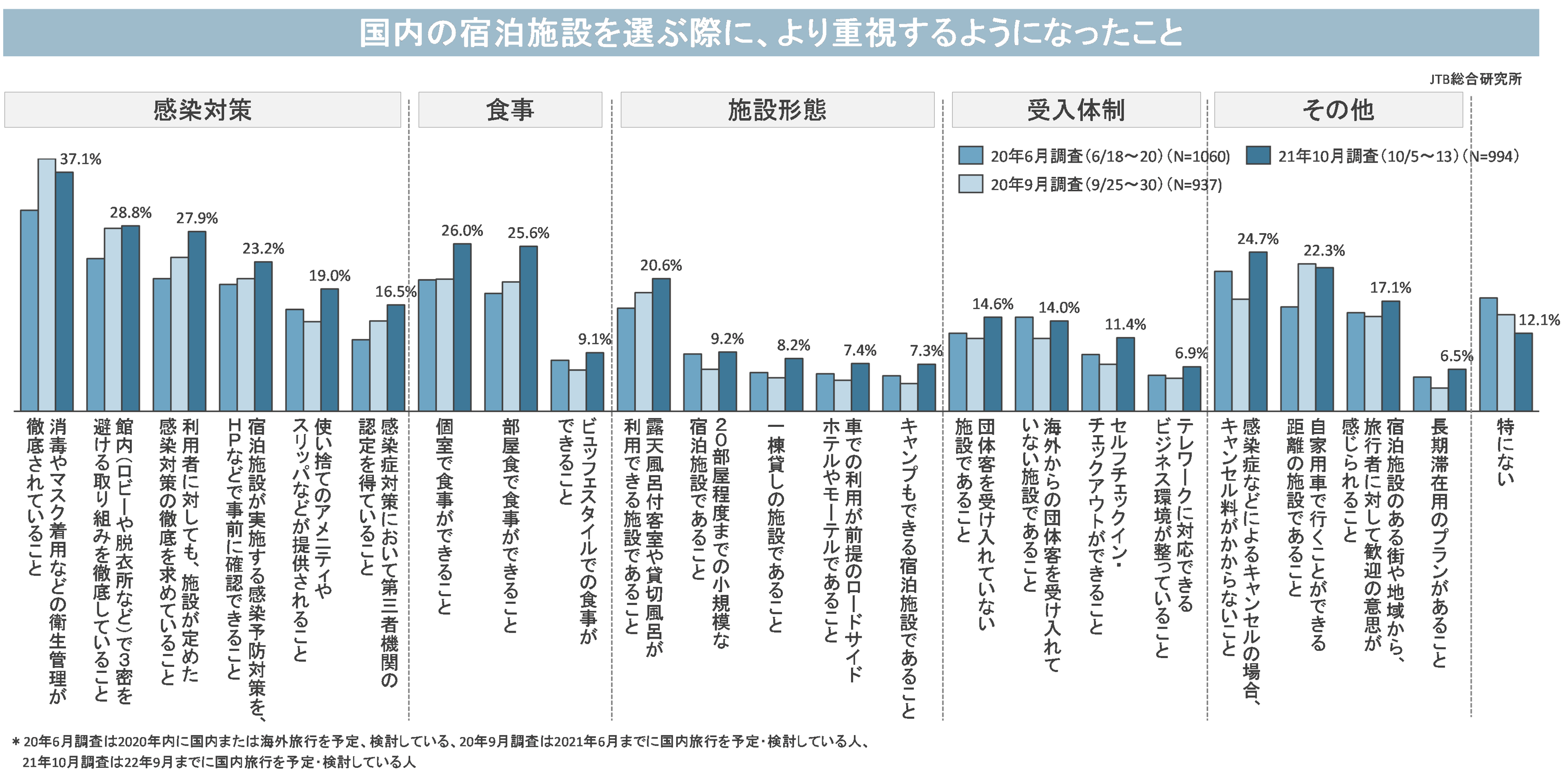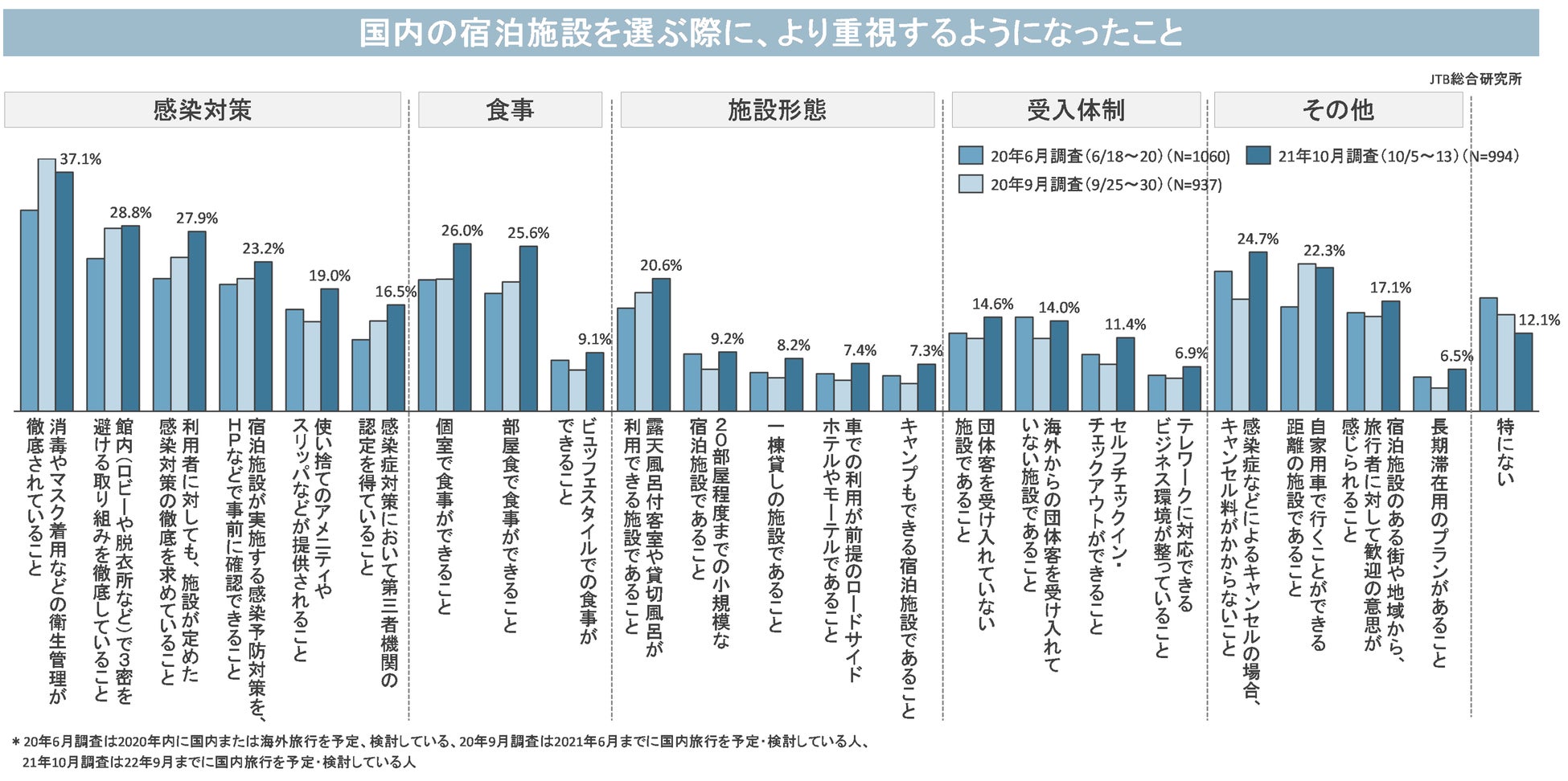 ●旅行者自身の感染防止意識はコロナ禍が長引くほど強まる傾向が見られます。JTB総合研究所が実施した『新型コロナウイルス感染拡大による、暮らしや心の変化と旅行に関する意識調査』のなかで、旅行者が国内において宿泊施設を選ぶ際に重視する点について、2020年9月と2021年10月の調査結果を比較したところ、ほぼすべての項目で2021年10月調査の方がより強い感染防止対策を望む結果となりました。特に食事については、「個室で食事ができること(2021年10月調査 26.0%、+5.5 ポイント)」、「部屋食で食事ができること(同 25.6%、+5.5 ポイント)」との結果となり、いずれも大きく上昇しました(図表7)。