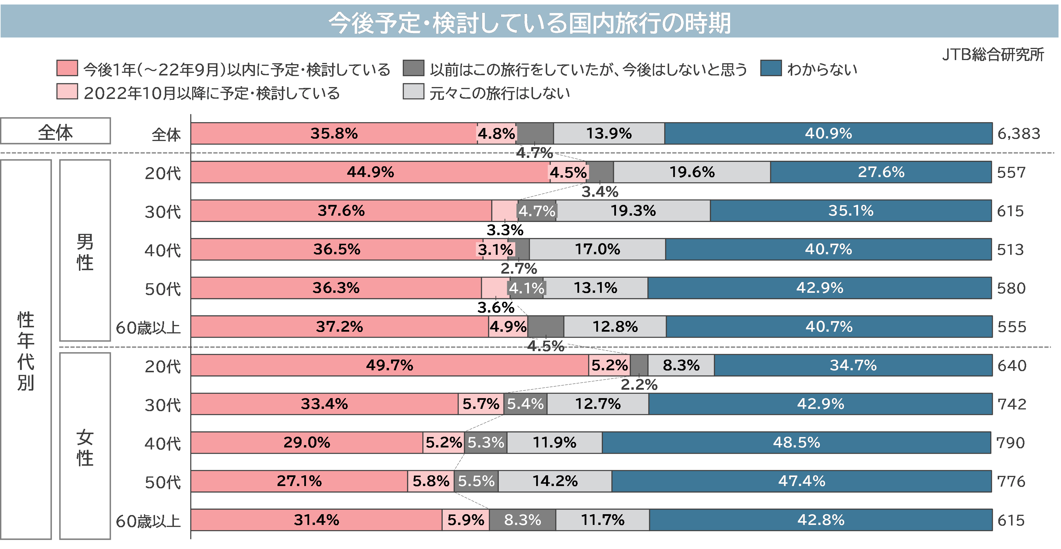 旅行で起きた変化 新型コロナの影響は、旅行意識や行動にも変化をもたらしています。感染予防の観点から、旅行日数は短く、行先は居住地のある都道府県内もしくはその周辺、移動手段は公共交通を避け自家用車を利用、同行者は家族など近しい人(少人数)という「エリアツーリズム」が主流となりました。年配層(特に女性)は旅行を控え、逆に若者の旅行意欲は高い傾向がみられます。