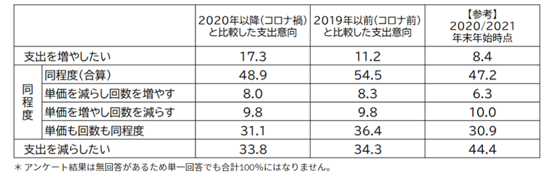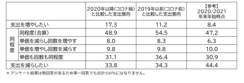 また、JTBでは、2021年11月に実施した旅行動向アンケートにおいて、「今後1年間の旅行の支出に対する意向」を「2019年以前(コロナ前)」「2020年以降(コロナ禍)」それぞれについて比較して聞きました。その結果、「2019年以前(コロナ前)と比較した支出意向」「2020年以降(コロナ禍)と比較した支出意向」はいずれも「支出を減らしたい」が「支出を増やしたい」を上回っており、2022年の旅行支出は一層厳しいものになると思われます。ただし、「2020年以降(コロナ禍)より旅行支出を増やしたい(17.3%)」は「2019年以前(コロナ前)より旅行支出を増やしたい(11.2%)」を6.1ポイント上回り、逆に「2020年以降(コロナ禍)より旅行支出を減らしたい(33.8%)」は「2019年以前(コロナ前)より旅行支出を減らしたい(34.3%)」を0.5ポイント下回ったことから、減少傾向はゆるやかになっており、消費支出の今後の持ち直しに期待がかかります(図表10)。