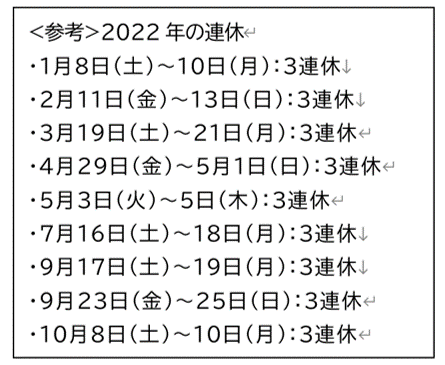 2022年のカレンダーは、3連休以上が9回あります。昨年は6回、うちゴールデンウィーク(GW)の5連休とオリンピックに関連する4連休がありました。今年のGWは5月2日(月)、6日(金)を休めば4月29日(金)から5月8日(日)まで10連休、8月は8月12日(金)を休めば4連休となります。9月の祝日による連休は、9月19日(月)の敬老の日を含む3連休と9月23日(金)の秋分の日を含む3連休との2回となり、遅い夏休みをとる人も想定されますが、長期休暇が取りにくい日並びと言えます。