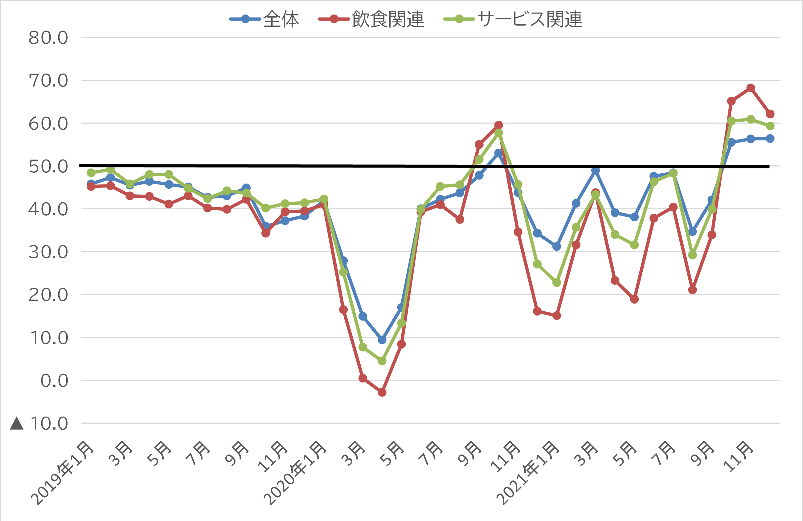 では、コロナ禍で旅行消費を取り巻く景況感はどうなっているのでしょうか。景気DI(現状)の推移をみると、2021年は9月まで特に飲食関連、サービス関連で悪い傾向が続きましたが、緊急事態宣言の全面解除により10月以降はいずれも良化し、明るい兆しが見られました(図表3)。また、雇用に関しては、総務省の発表によると、2021年12月の完全失業率は2.7%で、前月から0.1ポイント改善しました。また有効求人倍率(季節調整値)は1.16倍と、前月から0.01ポイント上昇しています。